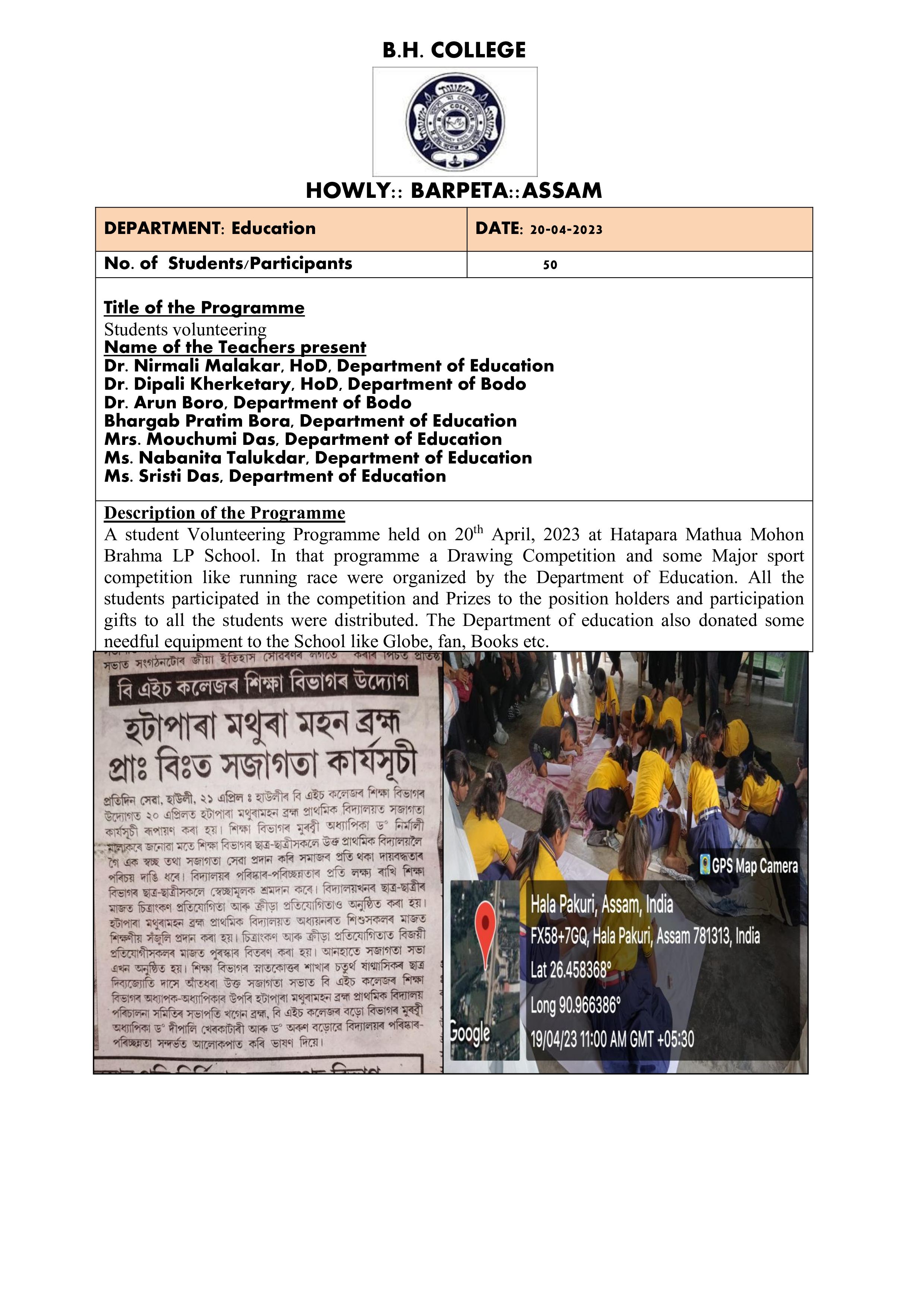 Description: A student Volunteering Programme held on 20th April, 2023 at Hatapara Mathua Mohon Brahma LP School. In that programme a Drawing Competition and some Major sport competition like running race were organized by the Department of Education. All the students participated in the competition and Prizes to the position holders and participation gifts to all the students were distributed. The Department of education also donated some needful equipment to the School like Globe, fan, Books etc.