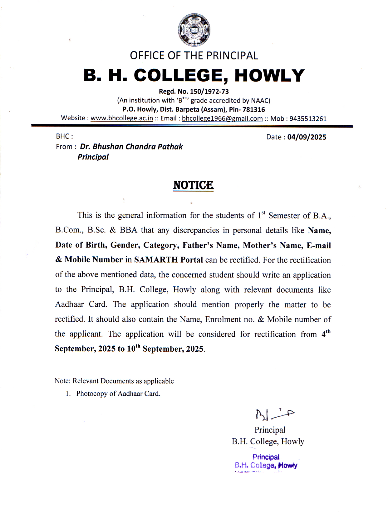 The origin of B.H. College dates back to january 1964 when Late Jadav Chandra Das,an eminent citizen ,mooted the idea for establishing a college at Howly.Accordingly,a public meeting was held at Howly Chandi Barua Bhawan with Late Abdul Kader Choudhury,(Mouzadar) as President and all those who were present very much appreciated the idea and unanimously decided to establish the college at the earliest.It Was further decided that the leading persons from different communities of Barpeta Road should also be apprised of the necessity of a College and a joint attempt be made for establishment of an 'Ideal College' in this localiy.