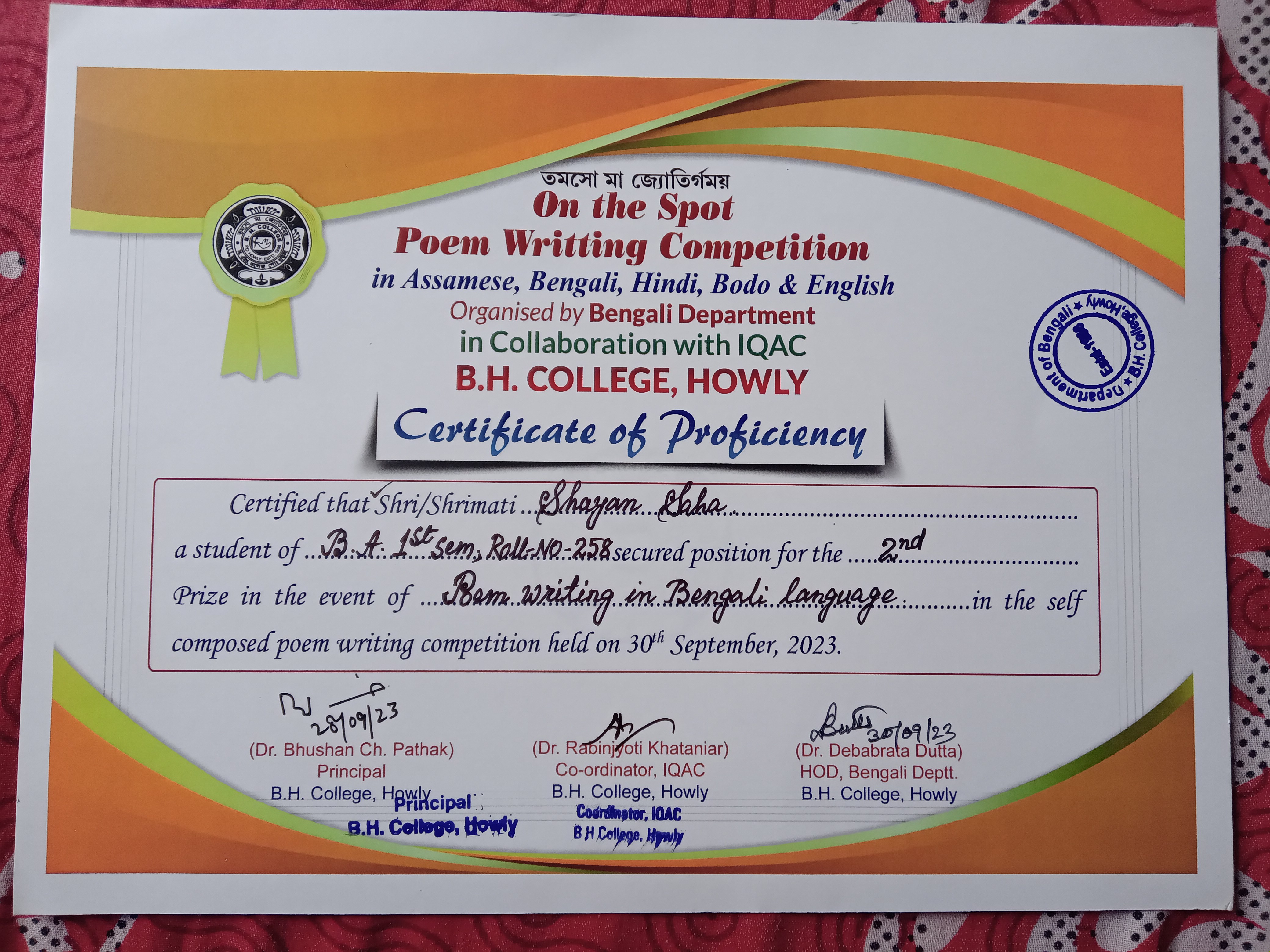 | Shayan Saha, a student of B.A 1st semester secured 2nd position in self composed poem writing competition organized by Bengali Department in collaboration with IQAC, B.H College Howly | 2023-09-30 | View File |