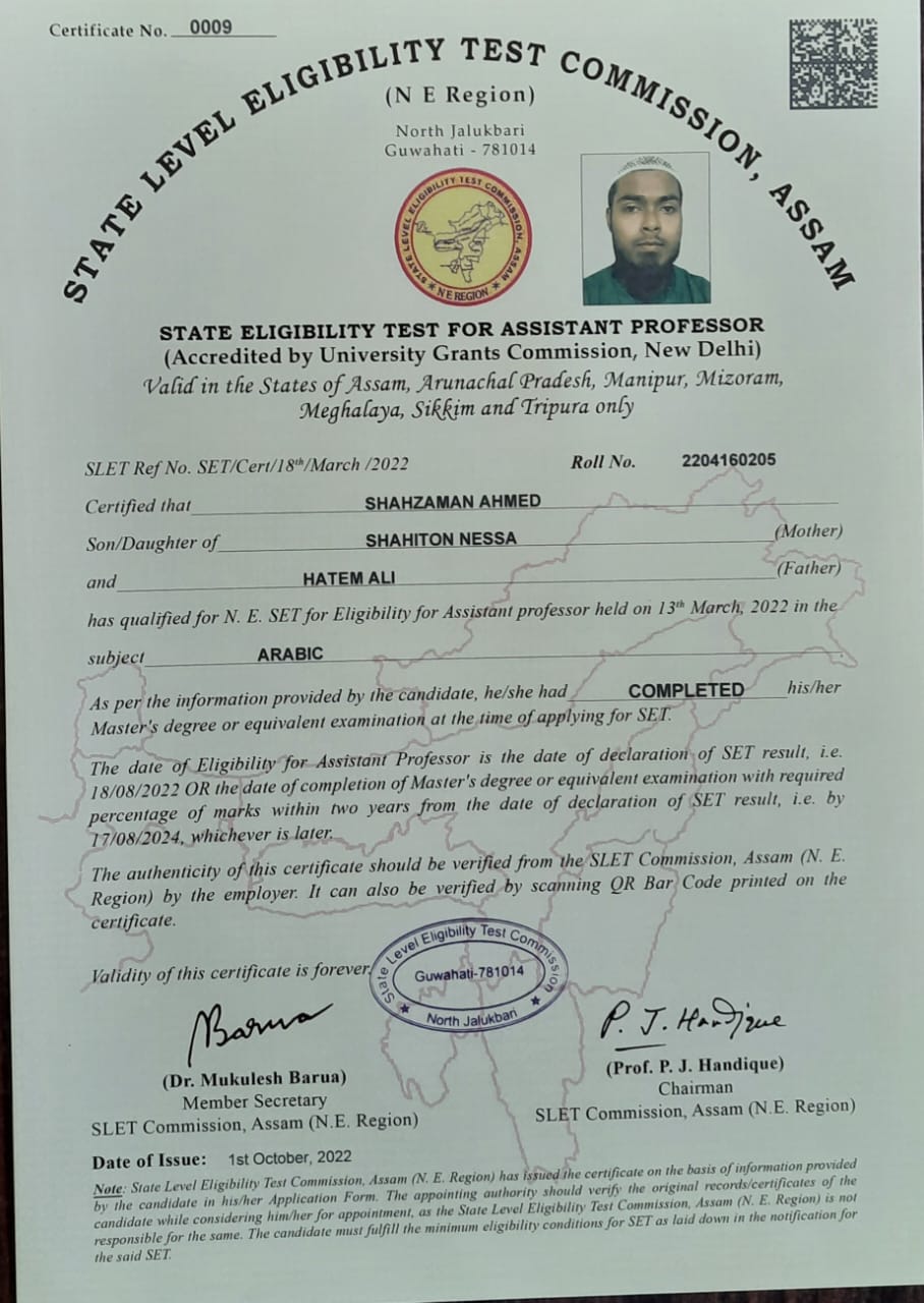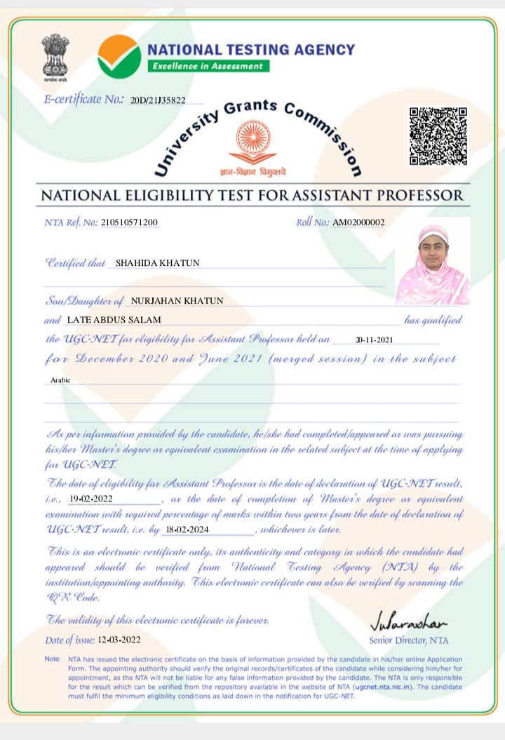 | Shahida Khatun passed B.A with Arabic (Honours) from B.H College, Howly under Gauhati University in 2017 and got first class 2nd position. She has cleared UGC NET in 2022. | 2022-03-12 | View File |