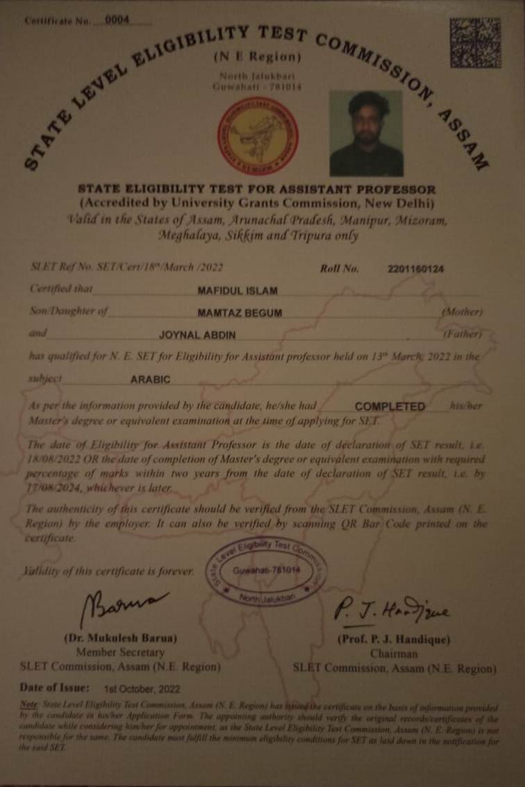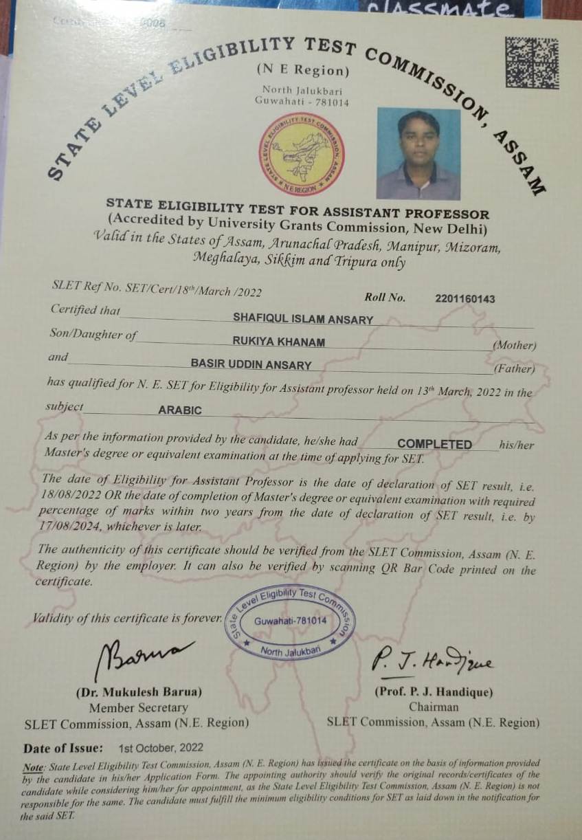 | 1. 4. Shafiqul Islam Ansary was a student of B.A Arabic (Honours) from B H College, Howly He has completed Ph .D under Gauhati University in 2019 and ha qualified in SLET exam in 2022 under NE Zone. | 2019-07-31 | View File |