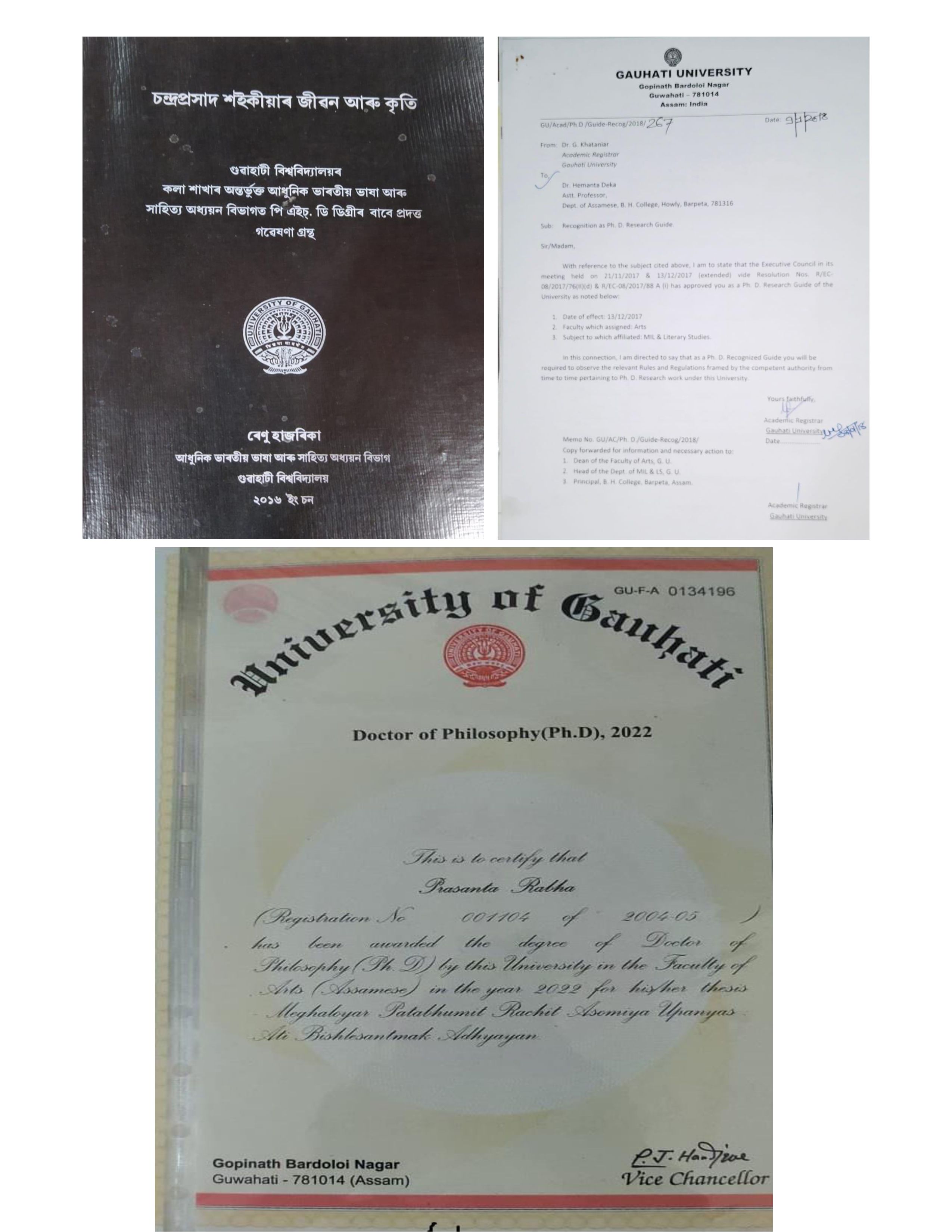 | Dr. Renu Hazarika, Dr. Hemanta Deka, Dr. Prasanta Rabha have got PhD degree from Gauhati University. Dr. Deka has also received PhD guideship of GU. | 2023-05-27 | View File |