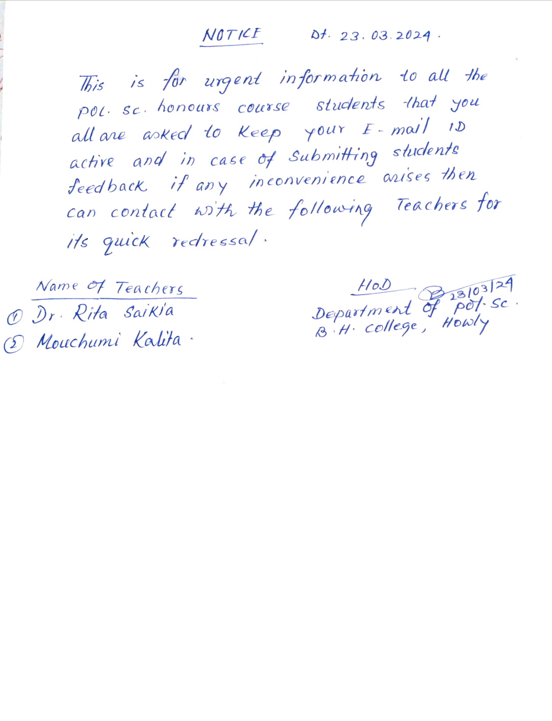 On the day of very opening of B.H.Collegein 1966, Political Science was started as General Subject.Subsequently in 1975 the department opened the Honours Course for the first time and since then this is being continued.While the Department was started it had only one founder teacher named Abdul Kader who waas the resident of Hila Pakuri of greater Howly Town under present Barpeta District.He continued his services in this Deptt. Untill his demise in 1992.Subsequently in 1969 another teacher named Azimuddin Saikia joined in the deptt.and he continued in his service upto 1972.Hereafter another teacher named Dr.Ramendra Kr .Das joined in the deptt. in 1972 and he contributed his services up to 1999.Hereafter Dr.Das got his new assignment as Principal of B.H.College. In 1999 and he took his superannuationin 2004.During this time another teacher Sri Radhacharan Rabha joined in the deptt.in 1977 and stayed in the deptt. Up to 2000.It is to be noted that sri Rabha joined his new assignment as Director of Students Welfare,Gauhati University in the year 2000 and he got his supeannuation from Guwahati University.It is important to note that Sri Rabha worked as Superintendent of B.H.College Men’s Hostel for long 15 years .Also he was a very successful Prof.In Charge of N,S.S. Under his leadership many students of the College got important prizes in different activities. Mrs. Sachi Prava Goswami ,an alumni of this deptt.of the college joined as lecturer in the deptt. In 1987 and she continued her services upto 31st January 2020.During her working period she was Vice Principal of the College for few years.Afterwards Sri Khurshed Alam an alumni of this deptt.joined as lecturer in 1993.It is to be noted that he got 1st position from this deptt .in 1984 of Bachelors Degree under Guwahati University.He is rendering his services at present also.Subsequently Mr K. Alam joined in the deptt.in 1989 and he is rendering his services till now.Another teacher named Bimal Basumatary joined the deptt .in 1999 against the post vacated due to the upgradation of Dr.Ramendra Kr Das as Principal of the college.Besides teaching Mr B.Basumatary has been discharging multiple assignments from time to time .He has been discharging as Prof. In charge for Gymnastics section of B.H.College Students Union for many consecutive years. He served as overall Teacher In Chargeo of B.H.College Student’s Union Body for the session 2018-19.The departmental teachers of Political Sci. Are also performing major role in the upliftment of the students of the college.Mr B.Basumatary has served his duty with utmost sincerity in regard to the hostel management cell of the college.Prof. B.Basumatary in the year 2019 guided a team of top 20 students of B.H.College to Rajasthan via Delhi under the joint govt. scheme between Assam and Rajasthan under cultural understanding.Mr B.Basumatary has also guided many students of B.H.College in the international film festival twice held in Guwahati,Sankerdeva Kalakshetra.Also under his returning officership student’s union body election was conducted in the year 2020.He is rendering his relentless services till date.Another teacher Baburam Basumatary joined as lecturer in the department in 2002 and he is also rendering his service in the department till now.In this connection it is to be mentioned here that one post is lying vacant against the retirement of S.P.Goswami and so at present there are three sanctioned post-filled.Because of vacancy of one post some contextual teachers are invited to the department on contextual basis from time to time.Few names of such contextual teachers are Nasiruddin Shah,Ashabul Hussain,Abdul Warish Seikh,Pinky Das etc.Needless to mention that our faculty members are rendering various kinds of services in regard to the corporate life of the college like Students Union ,Governing Body,Students Union Election,Hostel Management,Sports activities etc.It is important to mention that Mr Khurshed Alam has contributed his services as member of governing body of the college for two consecutive years.Also he served as one of the member of the Academic Court of Guwahati University for a term of three years.At present he is holding the office of Vice President of B.H.College Alumni Association.The department has arranged one departmental library for the greater interest of the students of the department.It contains a total number of near about 400 books at present.The total number of books of Pol.Sci. in central library is 2449.So,it is very much convenient for students by using the both libraries.