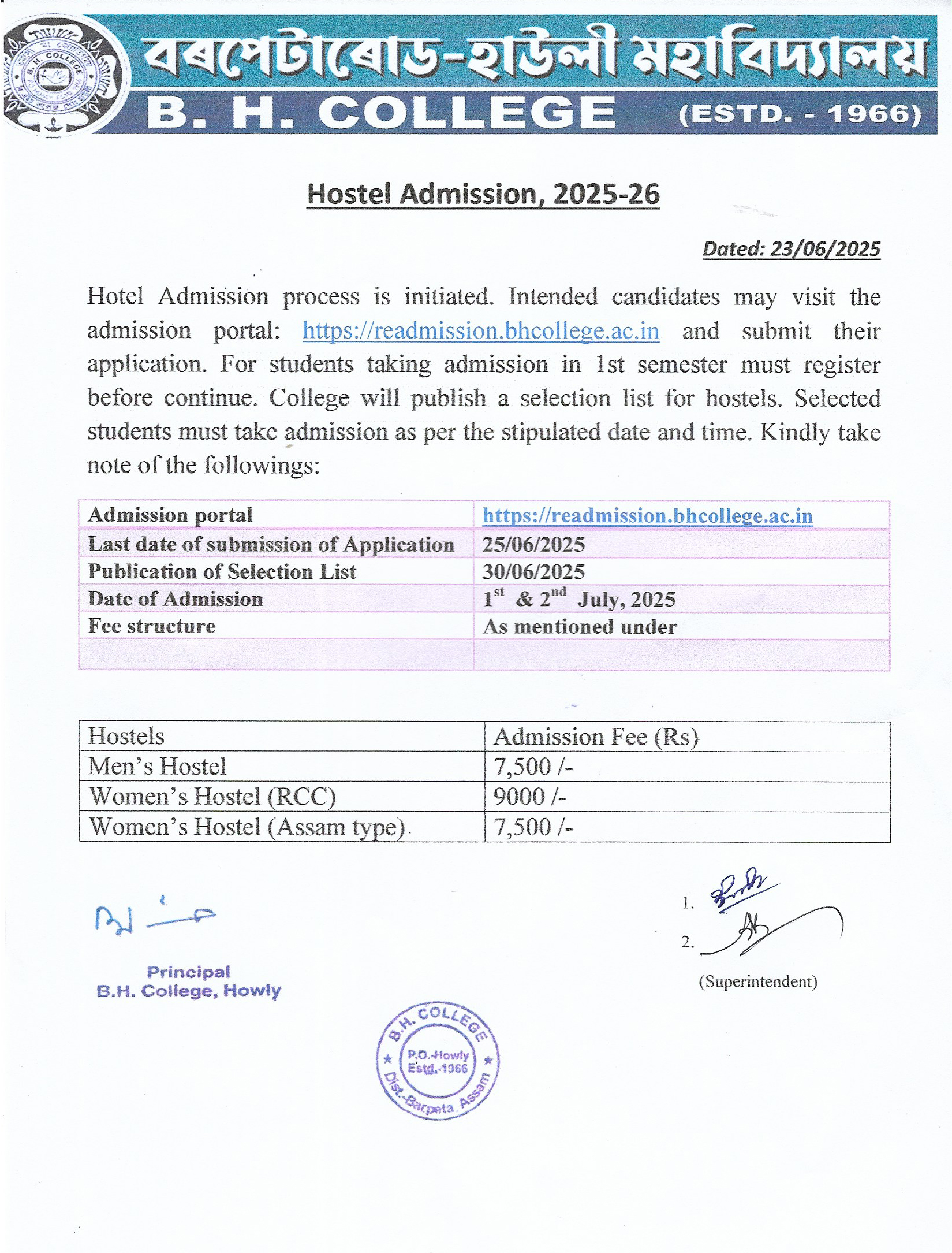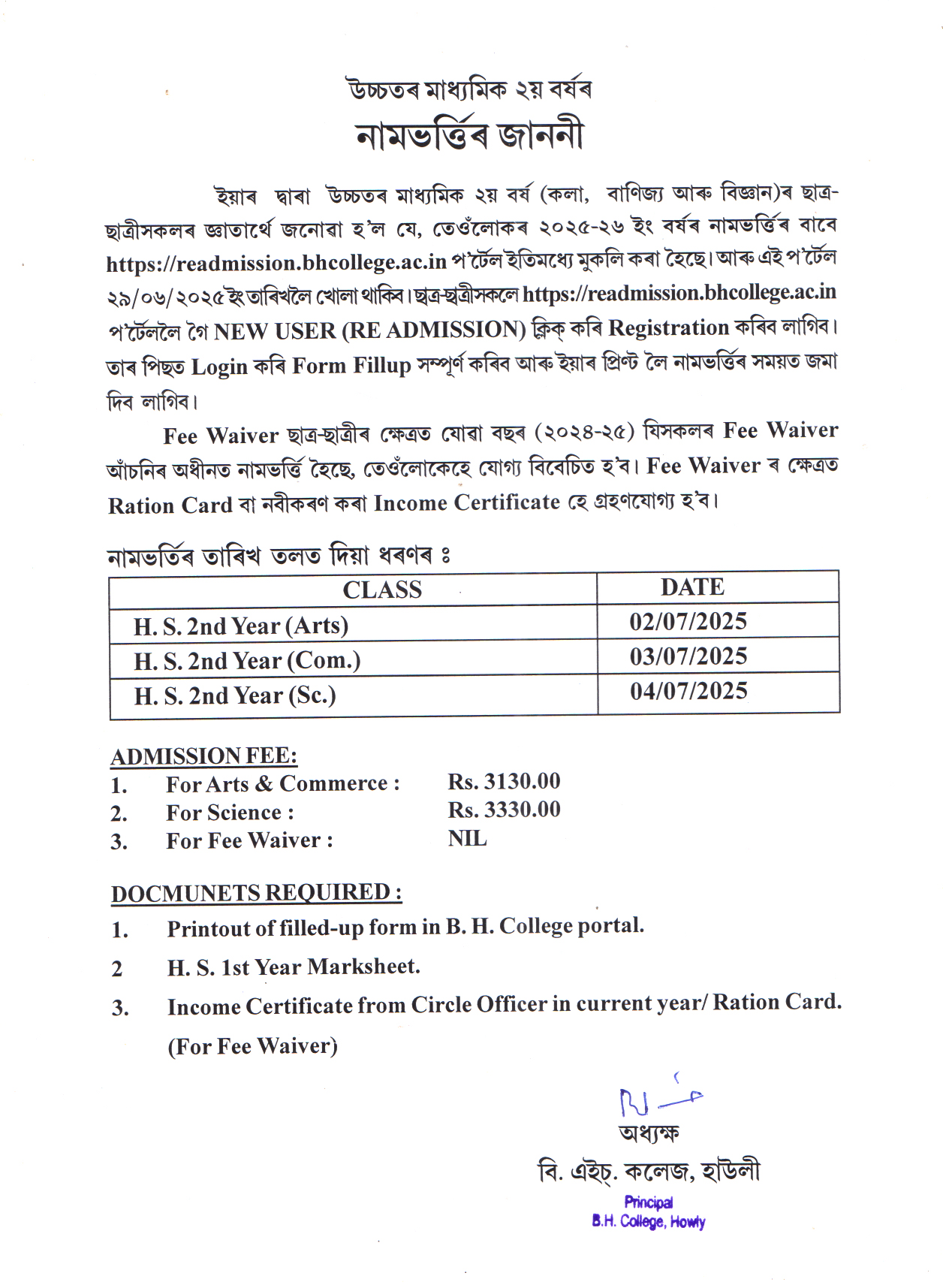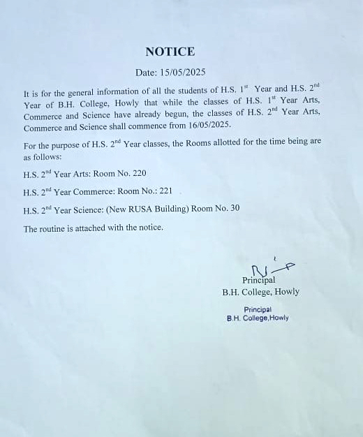 2025-04-27 - Admission Notice for H.S. 1st Year (Arts, Commerce & Science) for the session 2025-26. The Admission process will be start on 29th and 30th April 2025 in B. H. College, Howly at 10 AM onwards View