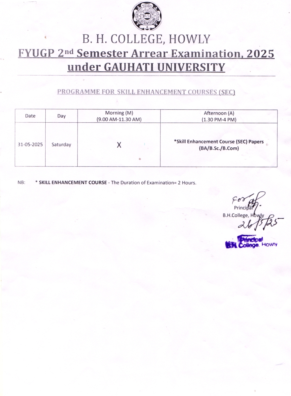2025-05-30 - Programme for Skill Enhancement Courses (SEC) of FYUGP 2nd Semester Arrear Examination under Guwahati University View