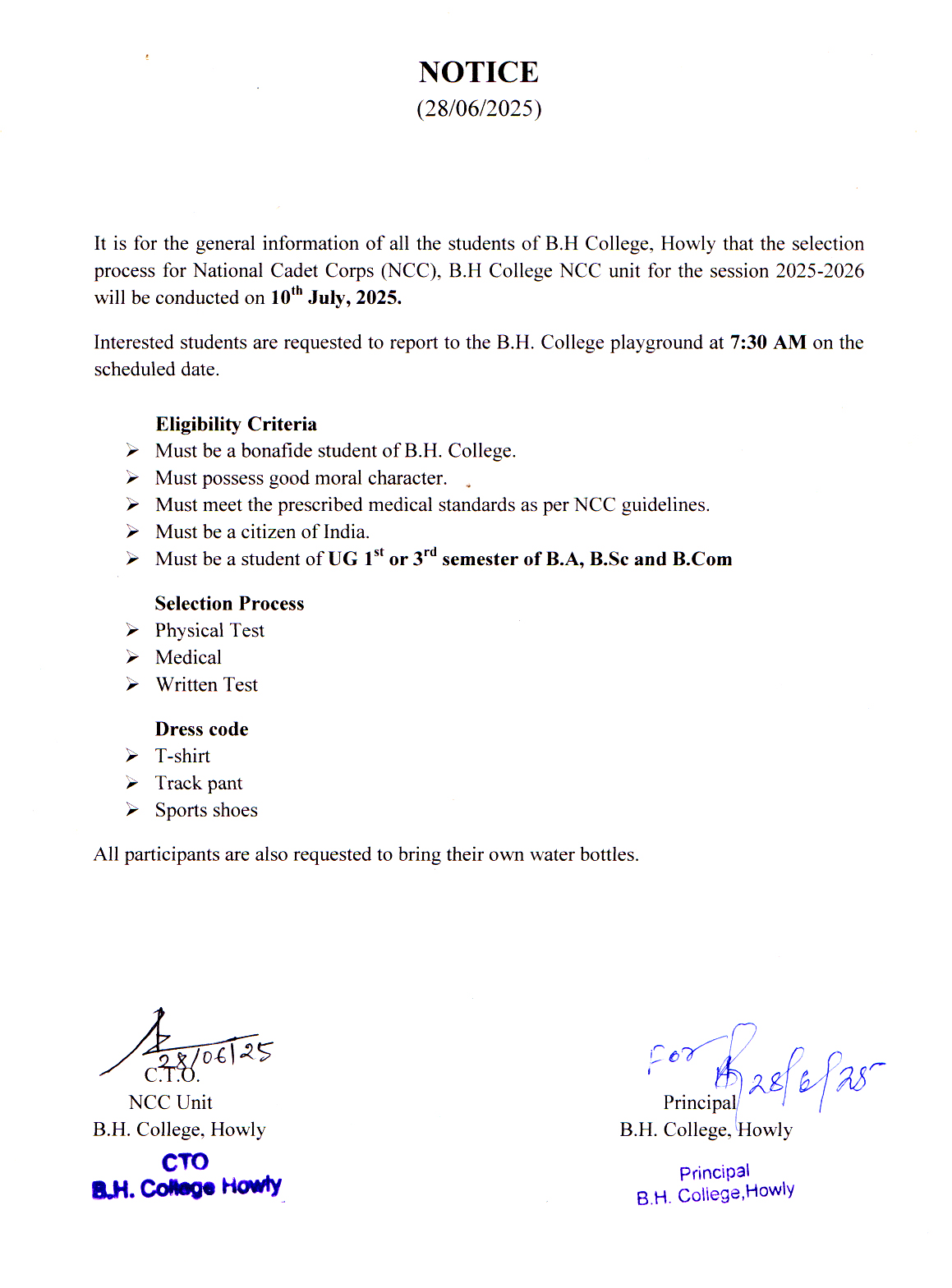 2025-06-30 - Admission Notice for B. H. College NCC Unit for the session 2025-2026 View