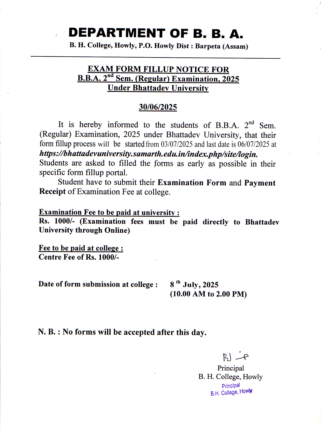 2025-06-30 - Online Exam Form fillup notice for Semester - II (BBA Regular BATCH) Examination, 2025 under Bhattadev University. View