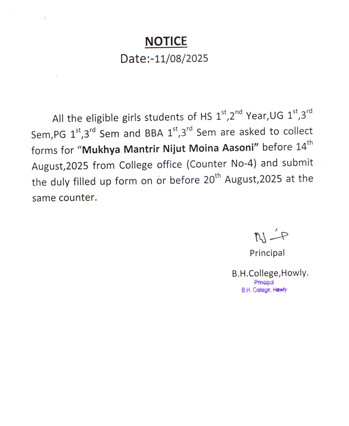 2025-08-07 - Notice regarding Central Programme and distribution of forms of Nijut Moina Scheme on 6th August, 2025 at the college auditorium. View