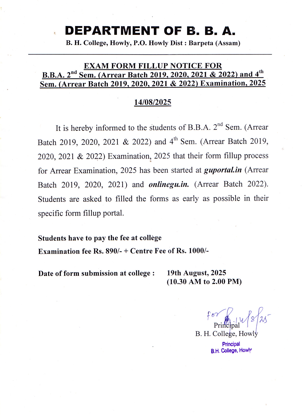 2025-08-14 - Form fill up notice for B.B.A. 2nd Sem. (Arrear Batch 2019, 2020, 2021 & 2022) and 4th Sem. (Arrear Batch 2019, 2020, 2021 & 2022) Examination, 2025 View