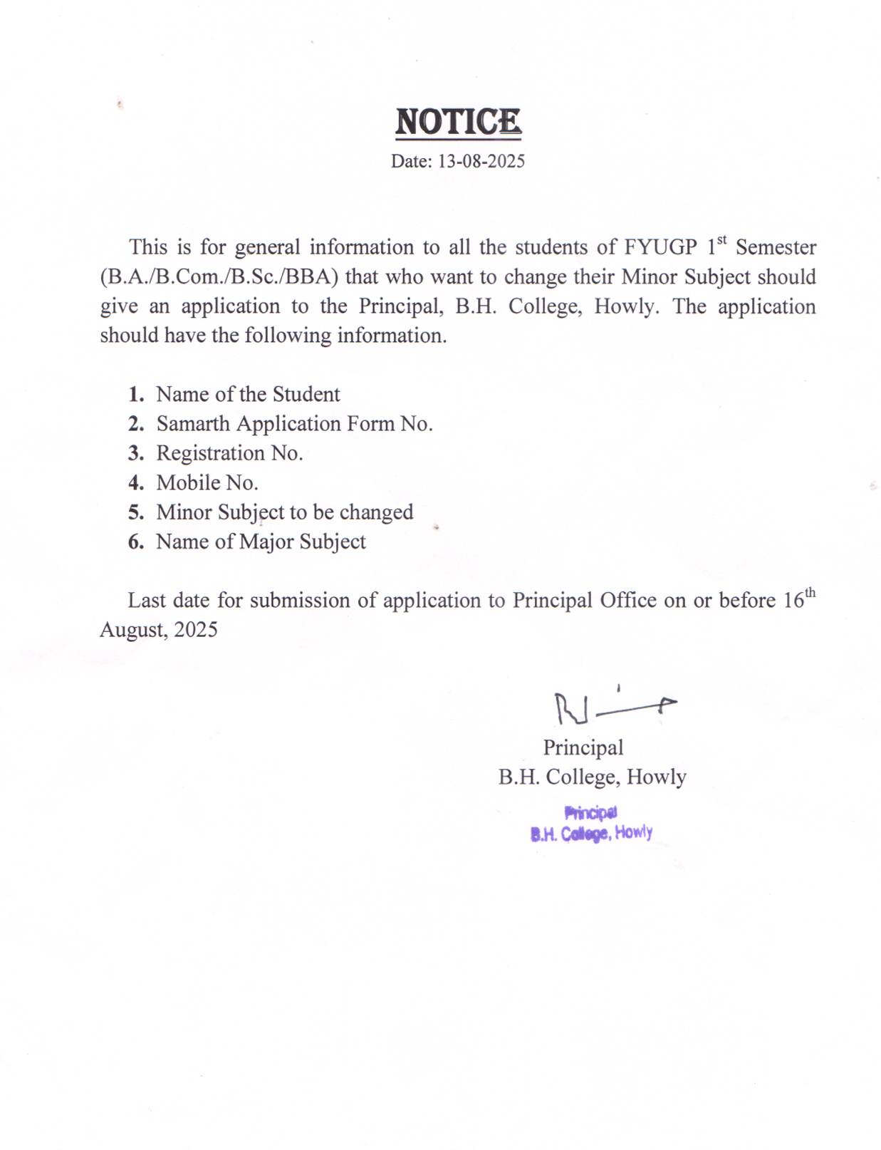 2025-08-19 - Notice regarding Minor Subject change of FYUGP 1st Semester Students of the session 2025-26. View