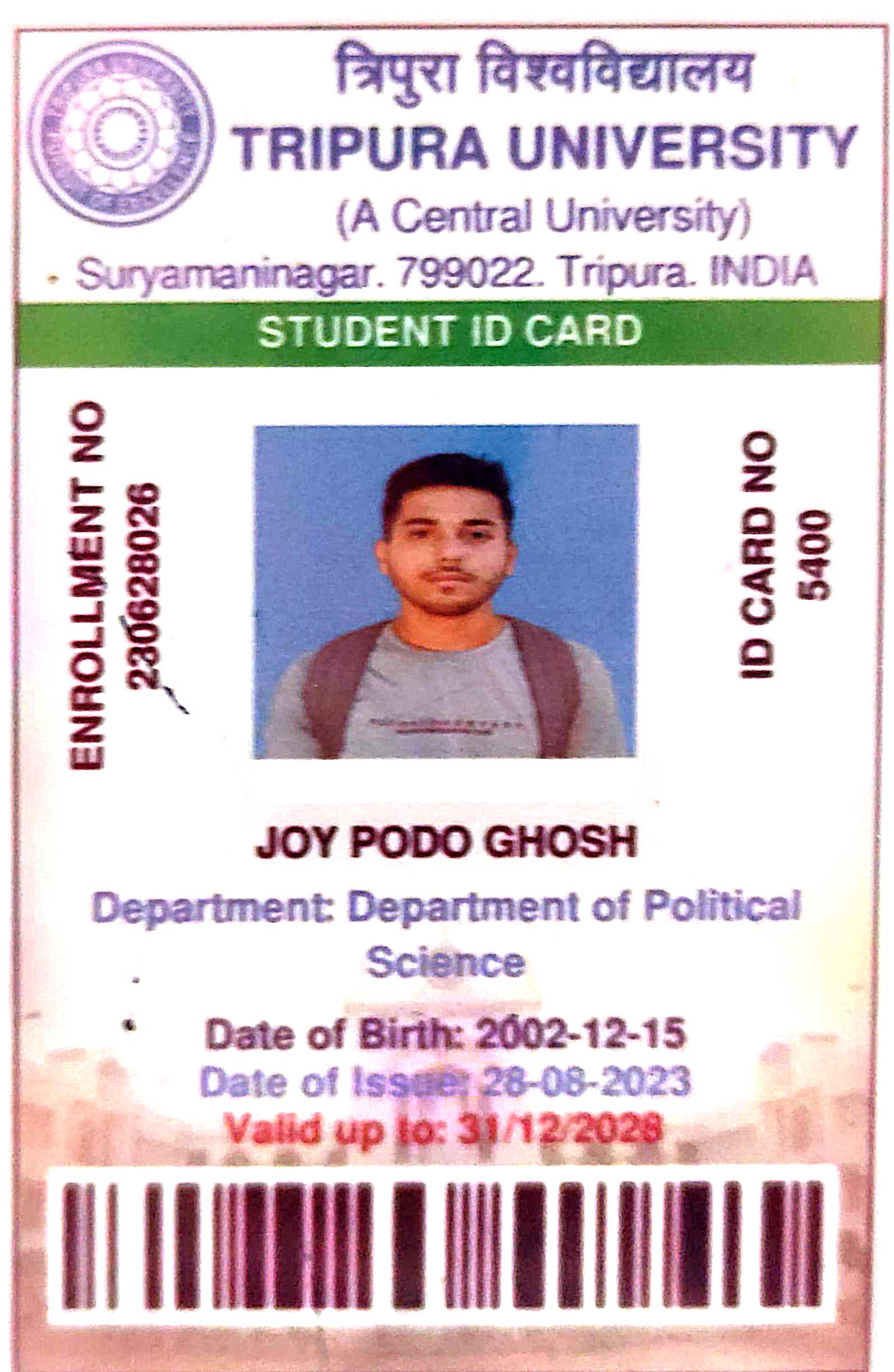 800 | POLITICAL SCIENCE | 2023 | Joy Podo Ghosh | B.A in Political Science | 2023 | Tripura University | M. A. in Political Science | View File |