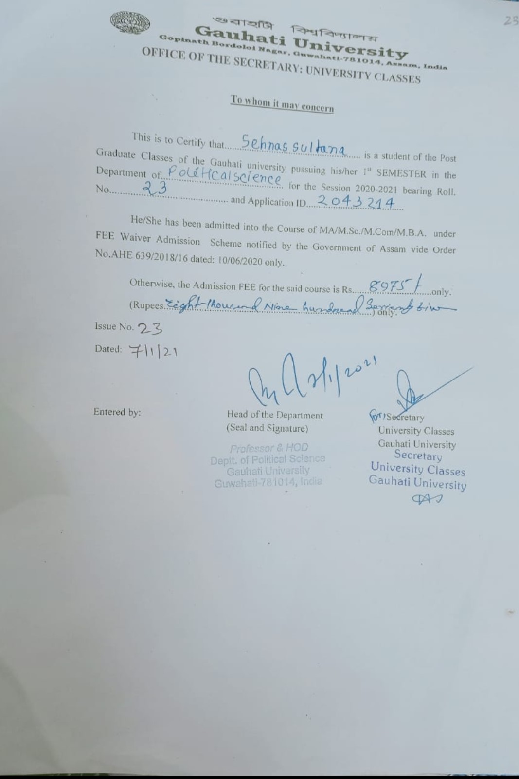 791 | POLITICAL SCIENCE | 2020 | Sehnas Sultana | B. A in Political Science | 2020 | Gauhati University | Master of Arts in Political Science | View File |