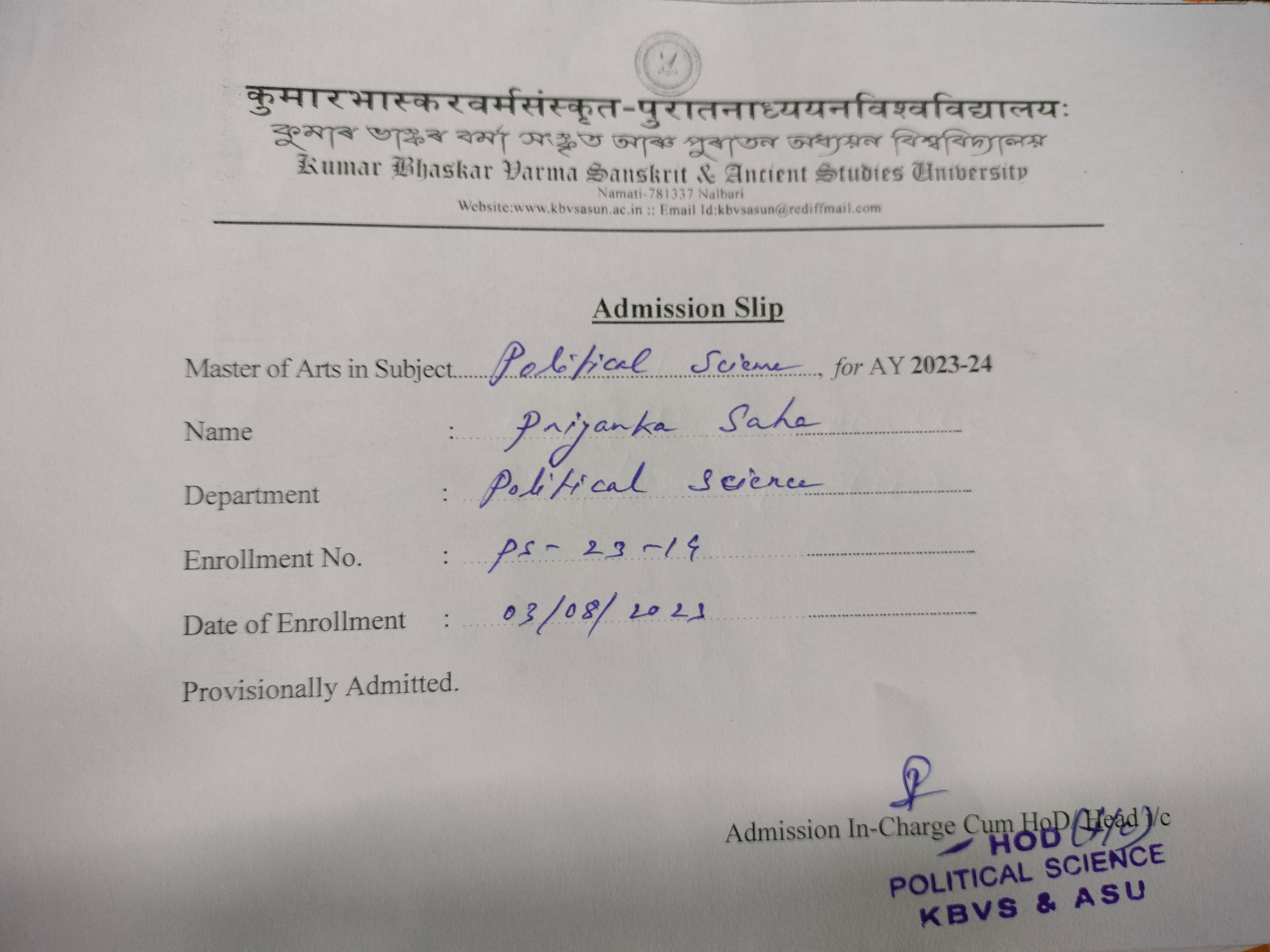 781 | POLITICAL SCIENCE | 2023 | Priyanka saha | B. A in Political Science | 2022 | Kumar Bhaskar Varma Sanskrit and ancient Studies University | Master of Arts in Political Science | View File |