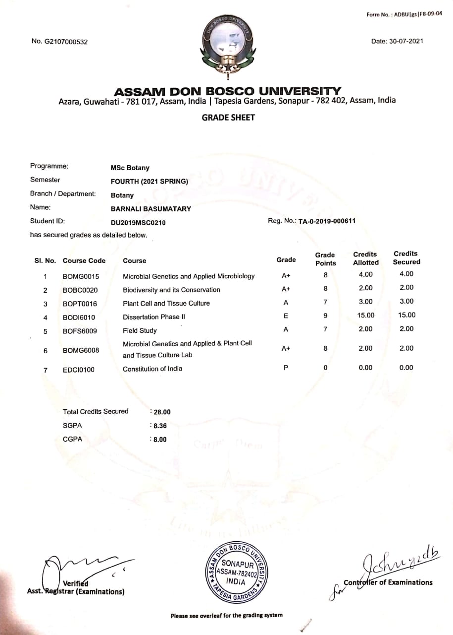 753 | BOTANY | 2019 | Barnali Basumatary | Botany | 2019 | Assam Don Bosco University, Sonapur | M.Sc in Botany | View File |