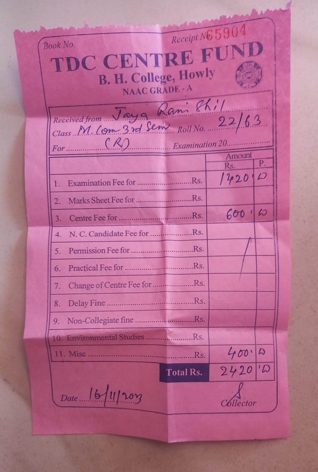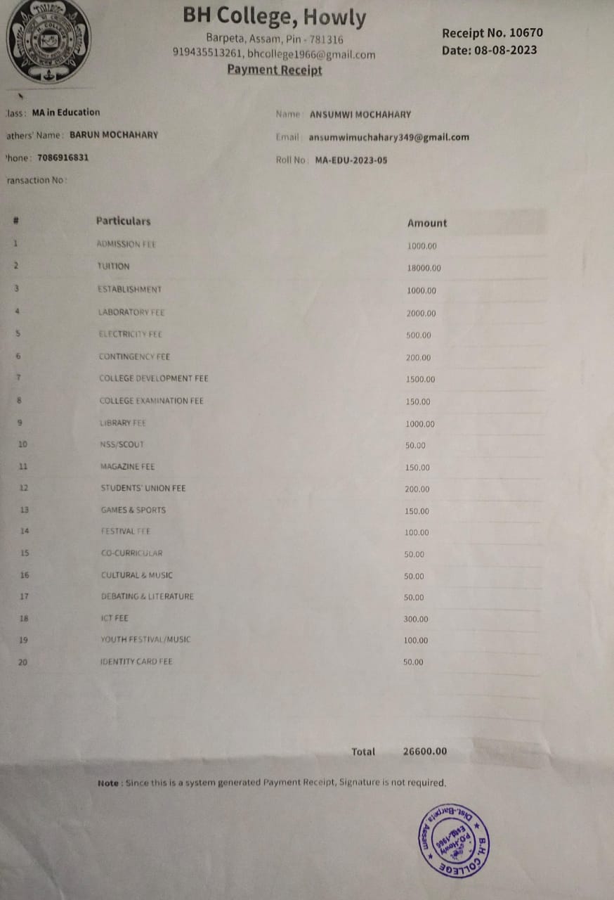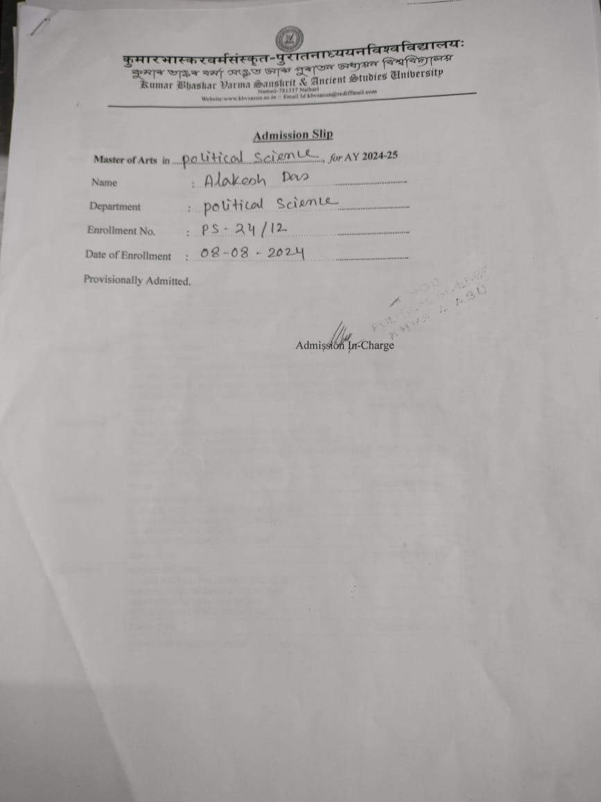 780 | POLITICAL SCIENCE | 2023 | Mousumi Nesha | B. A in Political Science | 2022 | Kumar Bhaskar Varma Sanskrit and ancient Studies University | Master of Arts in Political Science | View File |