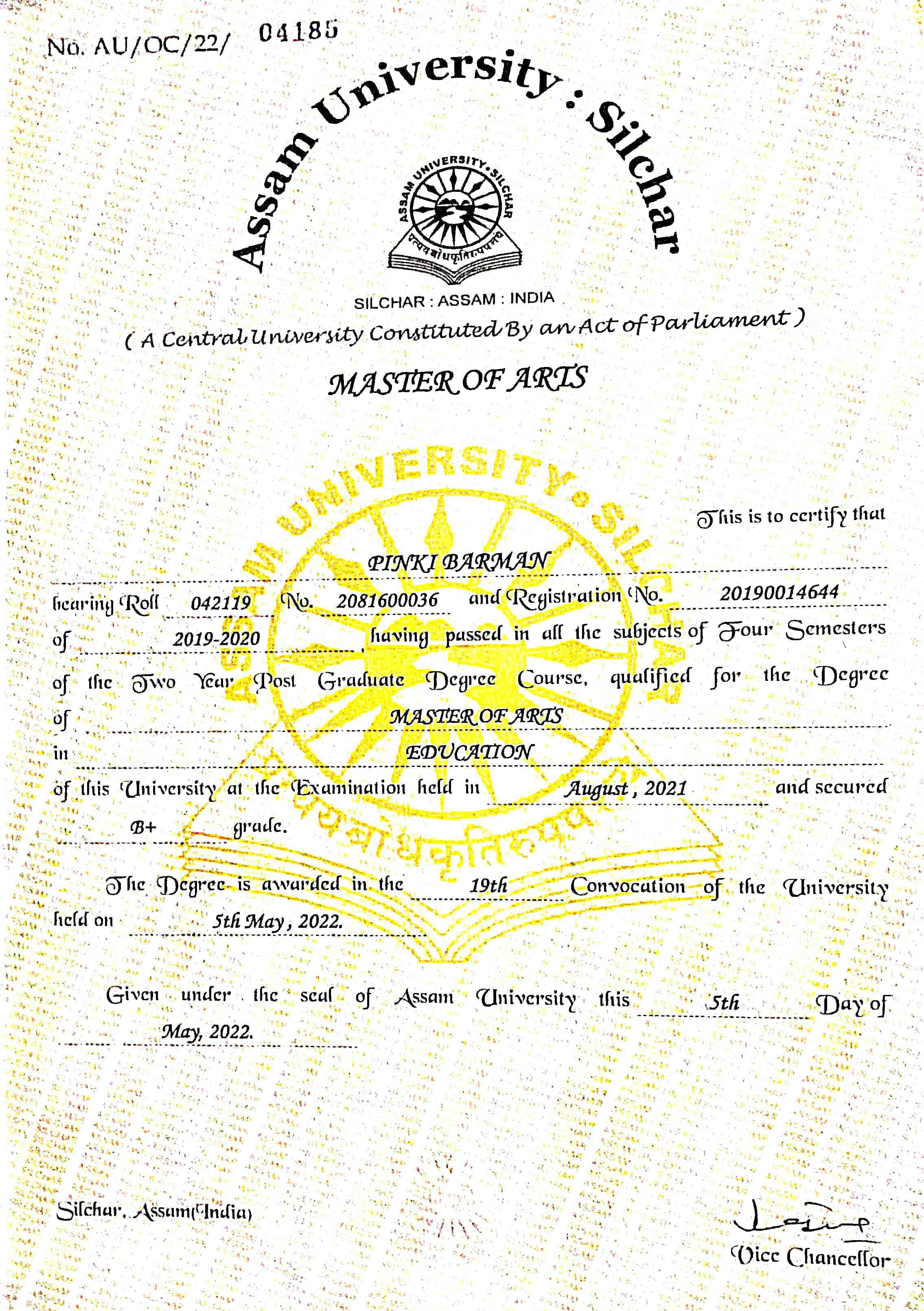 789 | POLITICAL SCIENCE | 2020 | Olvia Choudhary | B. A in Political Science | 2020 | Kumar Bhaskar Varma Sanskrit and ancient Studies University | Master of Arts in Political Science | View File |