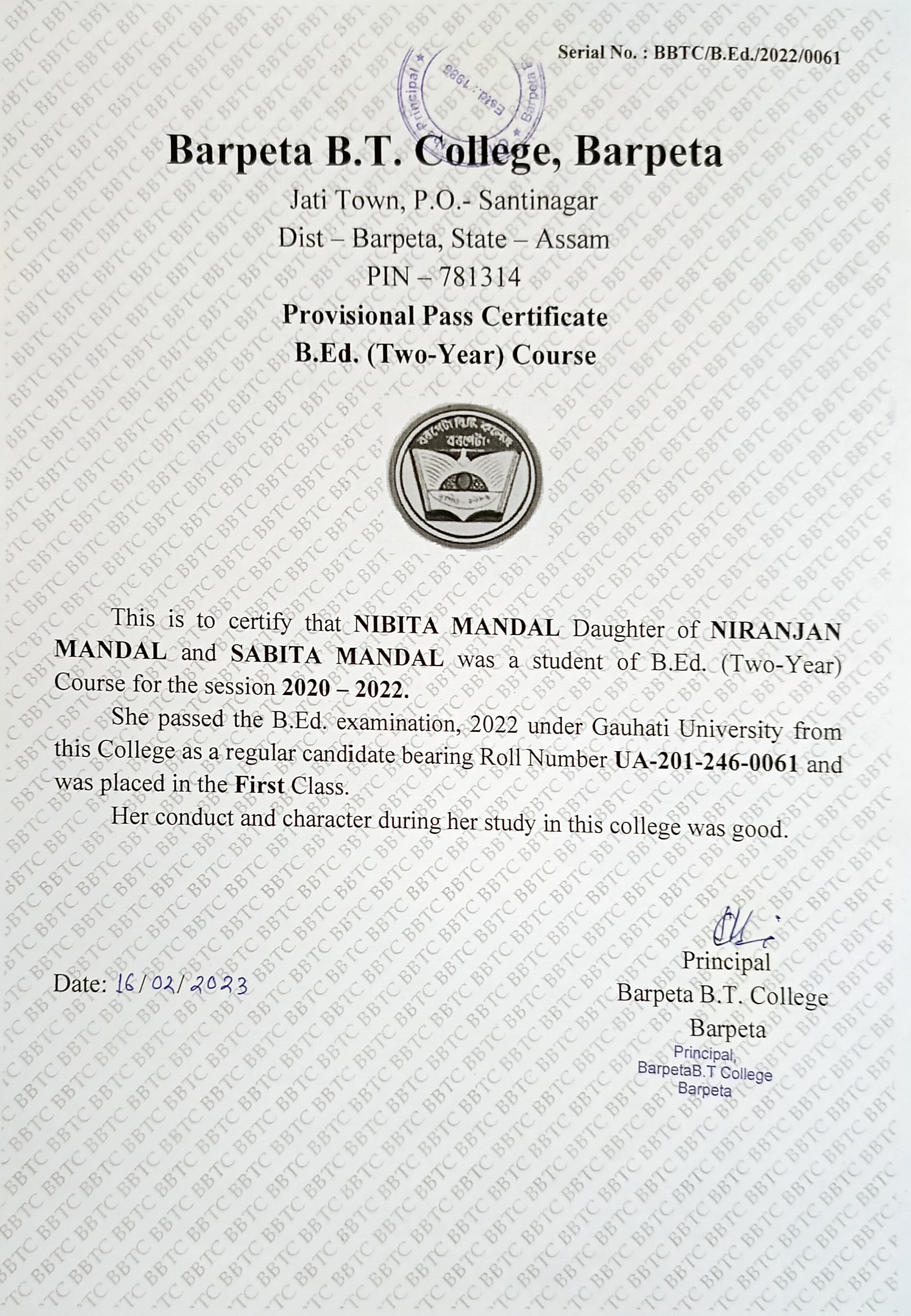 796 | POLITICAL SCIENCE | 2023 | Pinky Das | B. A in Political Science | 2020 | DIET Bongaigaon | B.Ed | View File |