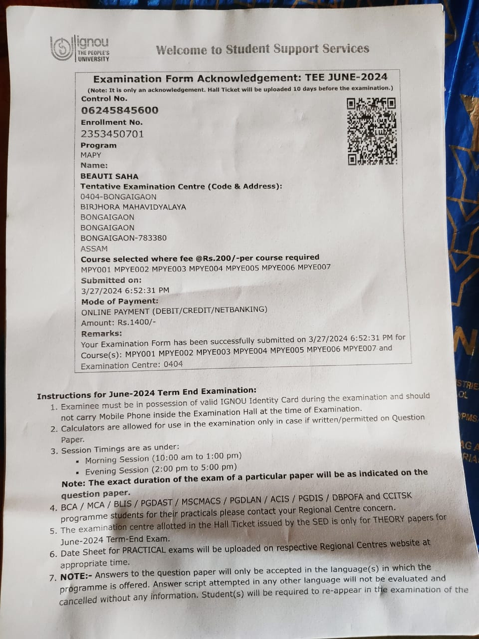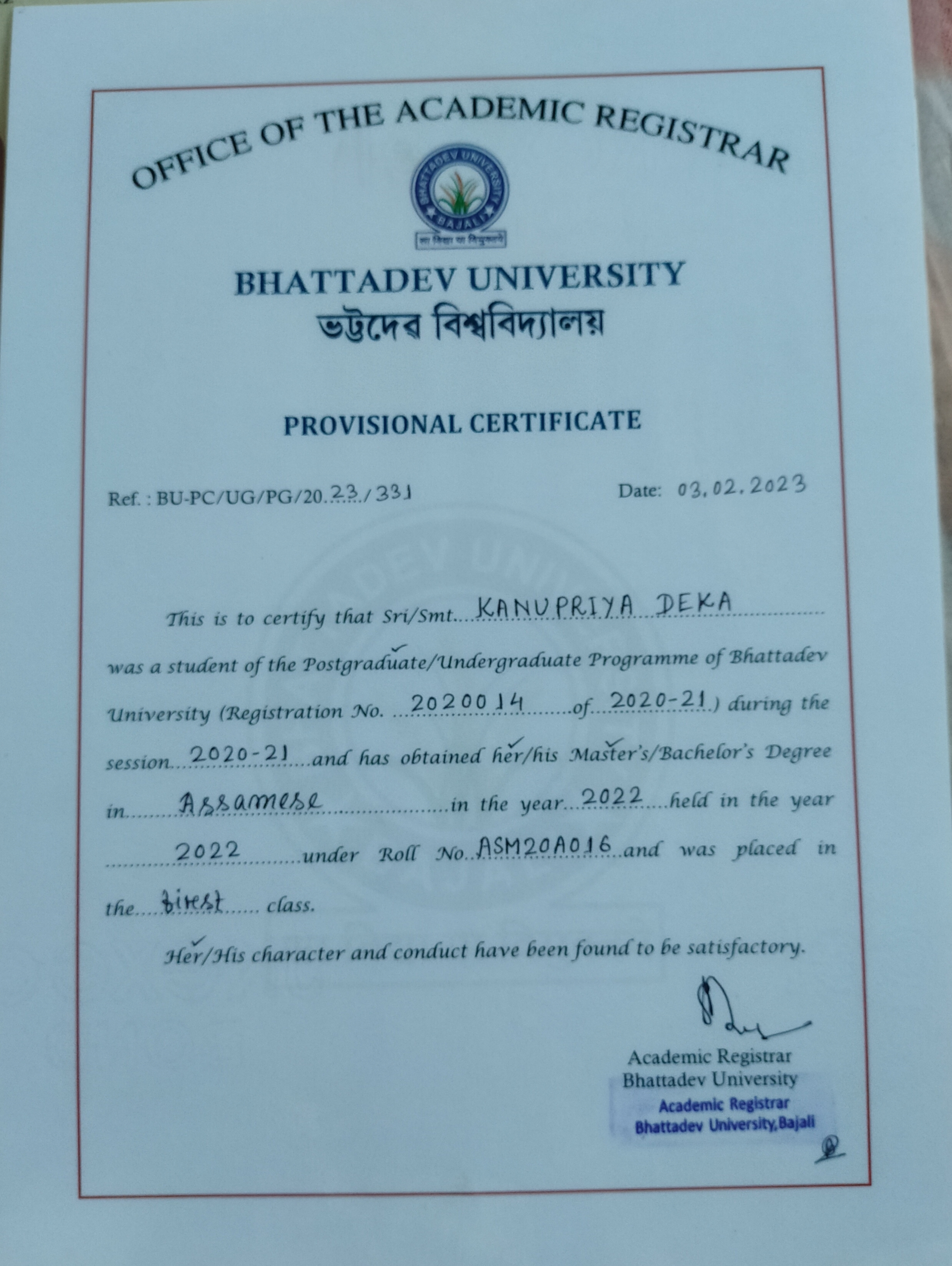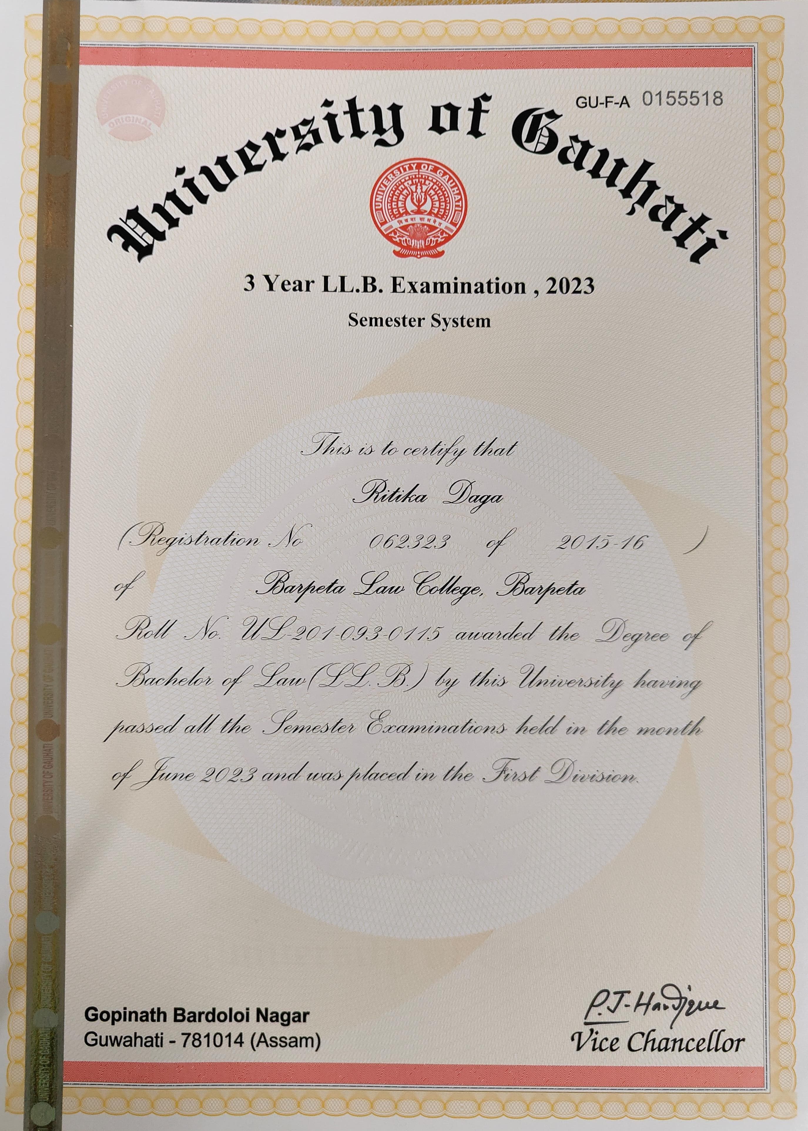 785 | POLITICAL SCIENCE | 2021 | Ritika Pathak | B. A in Political Science | 2021 | Gauhati University | LLB | View File |