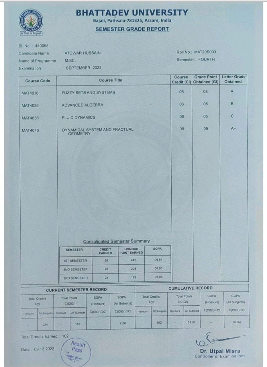 50 | MATHEMATICS | 2022 | Rizanur Hossain | B. Sc. Mathematics | 2022 | Bhattadev University | M. Sc. | View File |