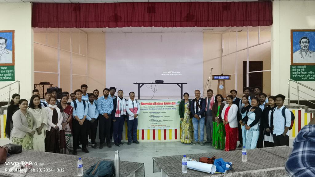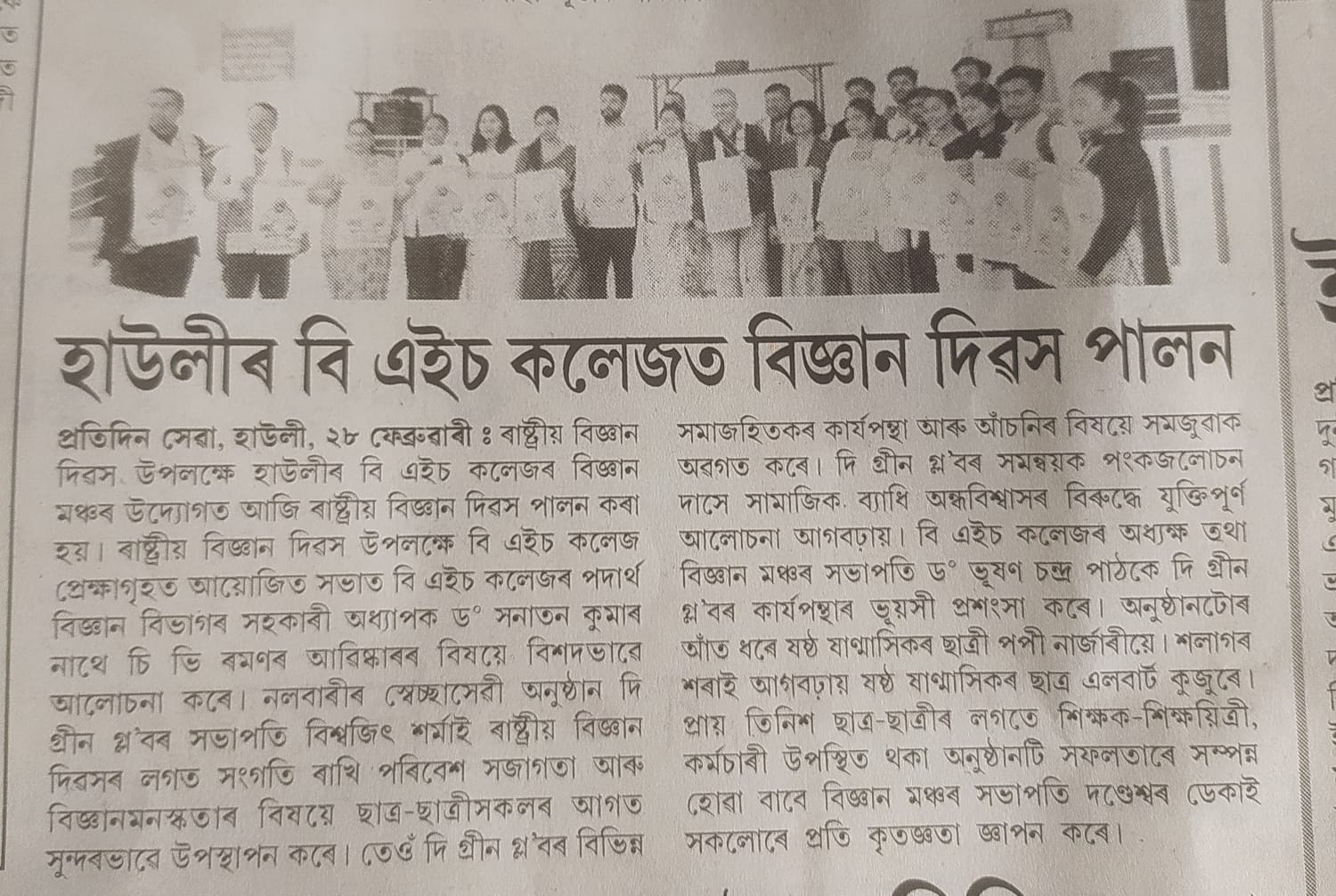 Today, 28 Feb 2024, on the occasion of National Science Day, B.H. College's ‘The Science Forum’ has organized the celebration of National Science Day. On this occasion, in a seminar was organized in the college auditorium where Dr. Sanatan Kr. Nath discussed in detail about C. V. Raman’s discoveries. The voluntary program of Nalbari, ‘The Green Globe’ raises awareness among students about environmental consciousness and scientific mindset. The President of the Green Globe, Vishwajit Sharma explained the different activities conducted by the organization. He informed about the various social welfare activities and initiatives of The Green Globe. The coordinator of The Green Globe, Pankaj Lochan Deka, enhances rational discussion against social misconceptions. The President of the Science Forum, Dr. Bhushan Chandra Pathak, praised the initiatives of The Green Globe. The program was anchored by the student of the sixth semester, Popi Narzary. The vote of thanks was offered by the student of the sixth semester, Albert Kujur. Nearly three hundred students, along with teachers, staff and attendees made the event successful. Therefore, the secretary of The Science Forum, Dandeswar Deka expressed satisfaction for the successful completion of the event.