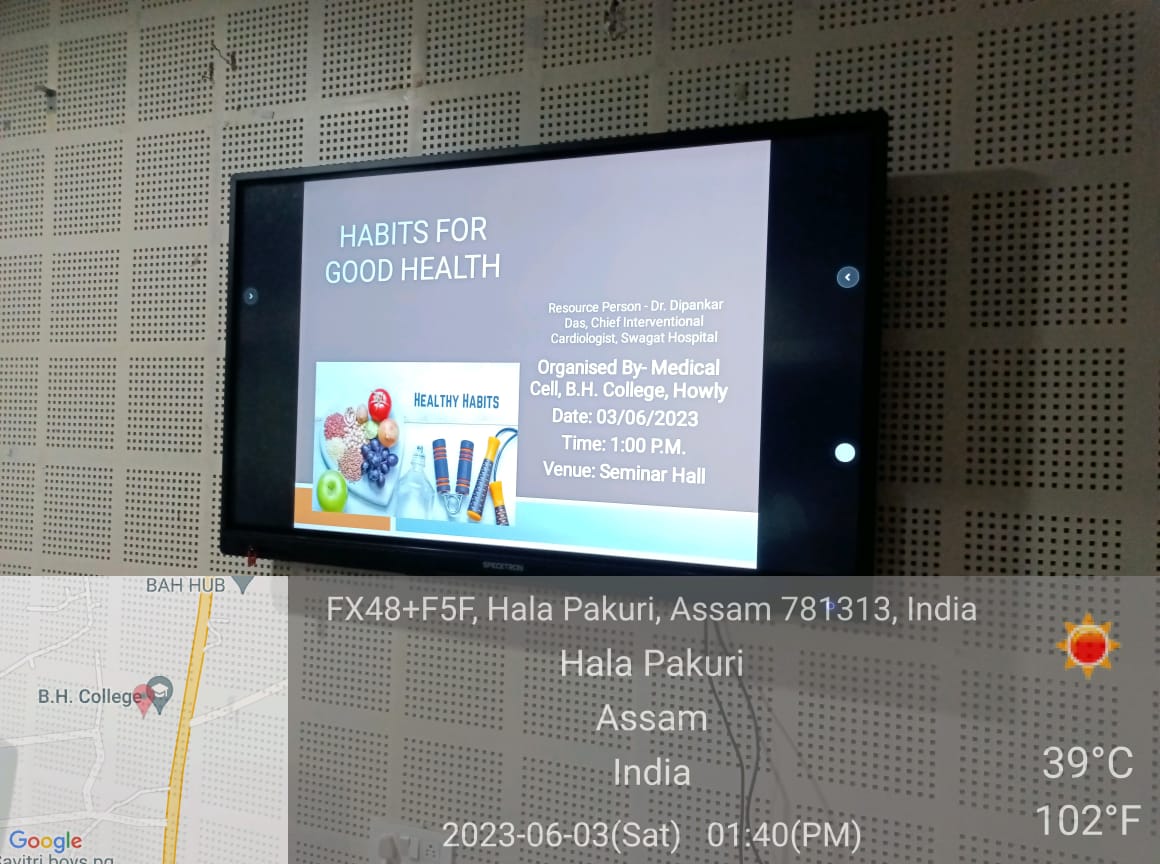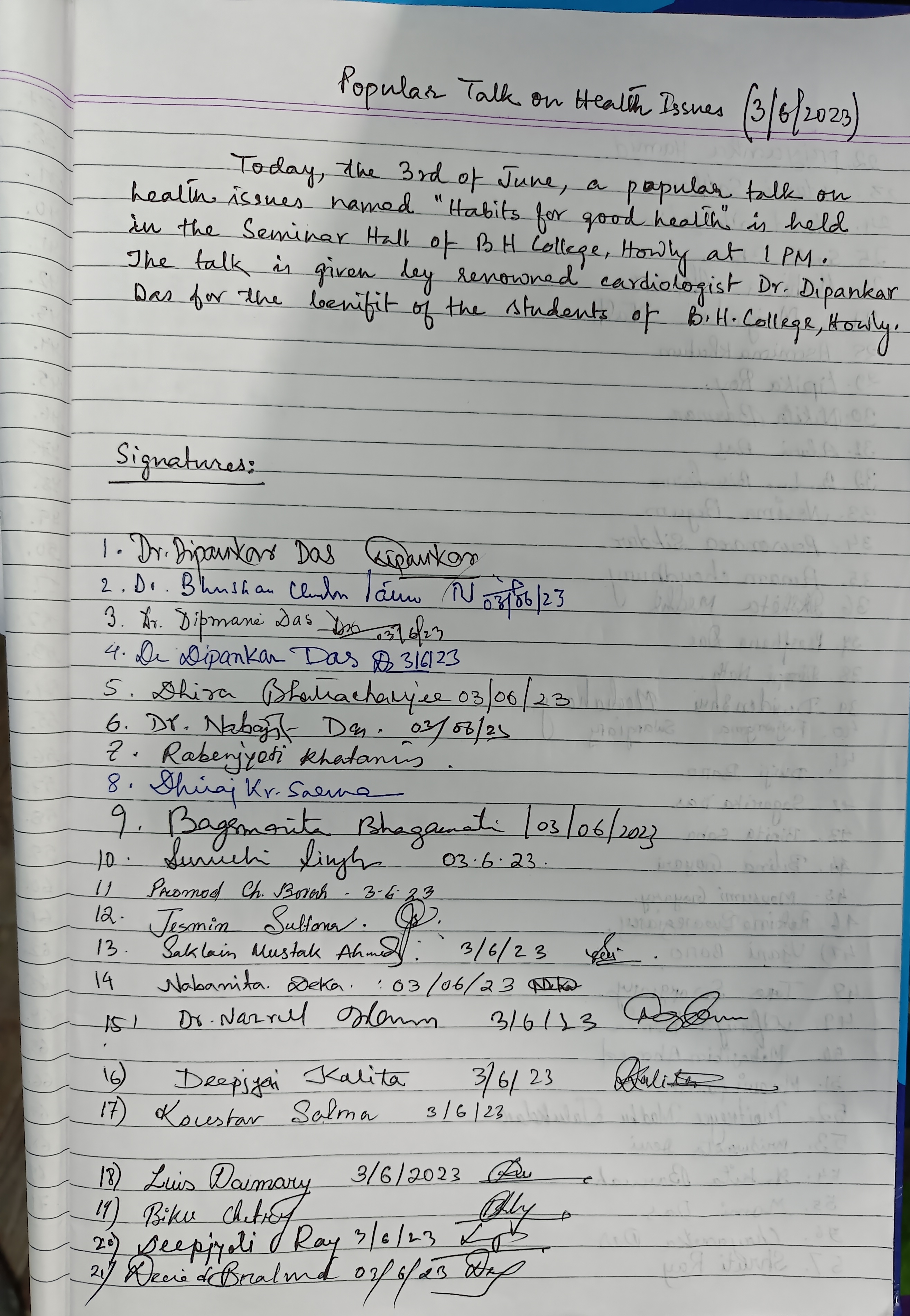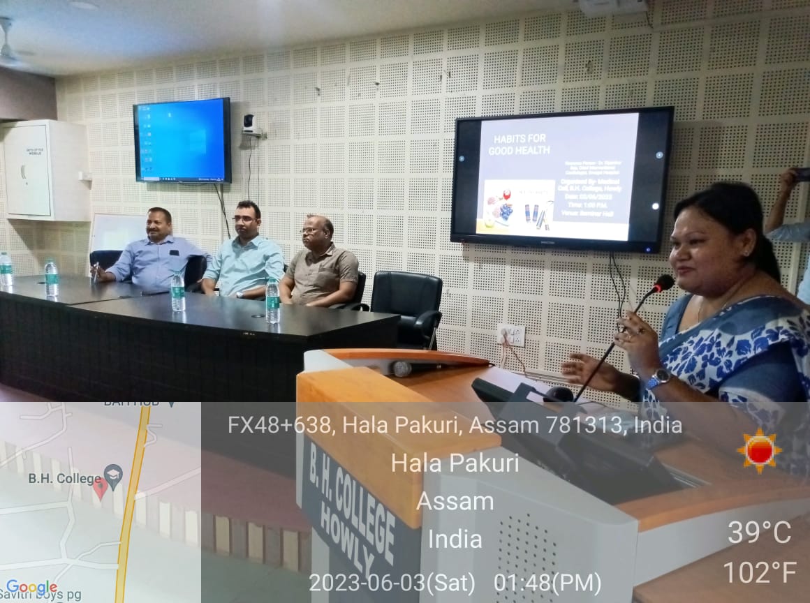 Description: The Medical Cell of B.H. College, Howly organized a Popular Talk on ‘Habits for Good Health’ on 03/06/2023. The resource person for the talk was Dr. Dipankar Das, Chief Interventional Cardiologist of Swagat Hospital, Guwahati. He emphasized about the habits that one can form in order to lead a healthy life. He reiterated about the food habits which are major underlying factor for various diseases. Furthermore, he talked about how stress leads to different diseases and how to alleviate stress. For students he highlighted how stress of preparation before the exam can have a negative impact on their health and therefore urged those to continuously study for shorter period of time but on a regular basis rather than studying everything at one go. He also took part in an interactive session with the students as well as the teachers. He cleared their doubts very well. Faculty members as well as students from different departments were present. On that event, Dr. Bhushan Chandra Pathak, Principal, B.H. College, Howly also contributed his enlightening speech on emotional well being. The program was concluded by a vote of thanks by Dhiraj Sharma, Assistant Professor, Deptt of Chemistry of the college.