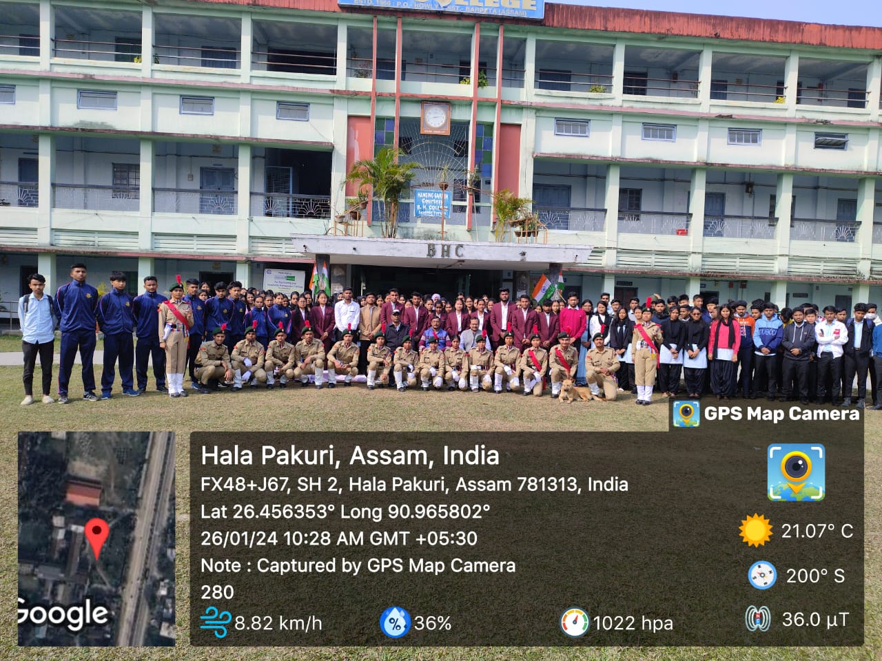 Description: on 26 Jan 2024 NCC cadets of B H College celebrated republic day with Marchpast programme. In the programme Dr. Bhushan Ch Pathak hoist the national flag and Prof. Promod Bora, Lt Dr. Shahjahan Ali and 76 students from boys and girls hostel participated with colourful cultural programme.