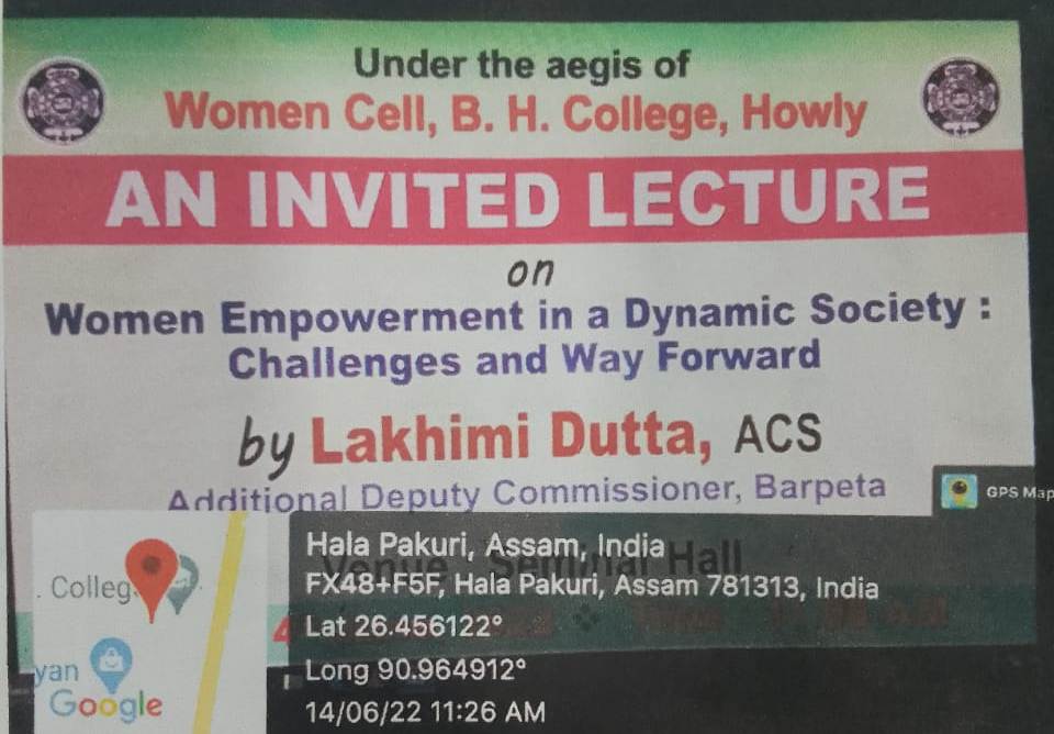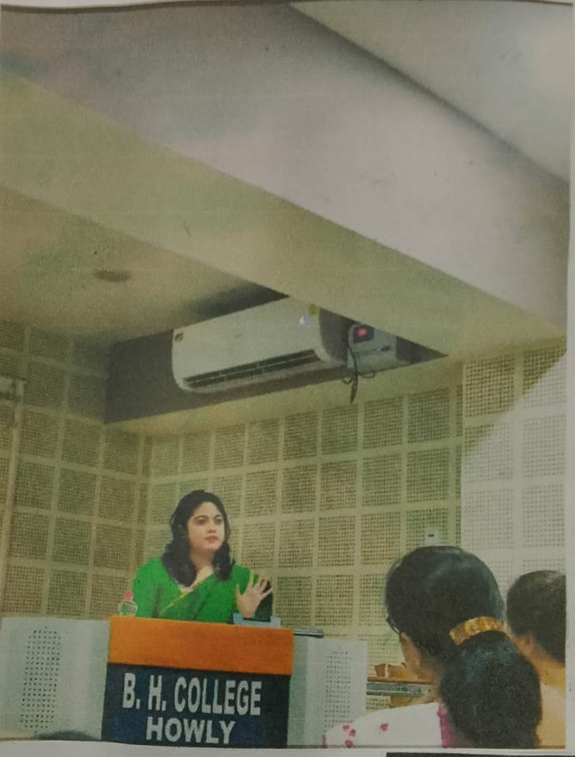 Description: Smt. Lakhimi Dutta, ACS, Additional Deputy Commissioner, Barpeta district was present as the Resource Person. The program was attended by 224 nos. of faculty members and the students. Besides speaking on various issues of women empowerment in details, the Resource Person gave an informative and inspiring lecture on various career options and preparation for various competitive examinations for the benefits of the students. At the end of the lecture, there was an interactive session of the students with the senior administrative officer.