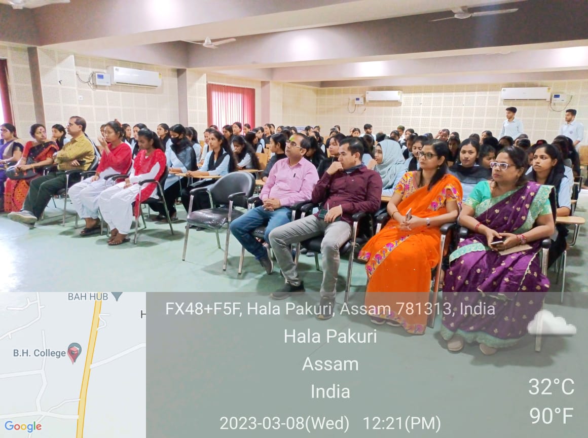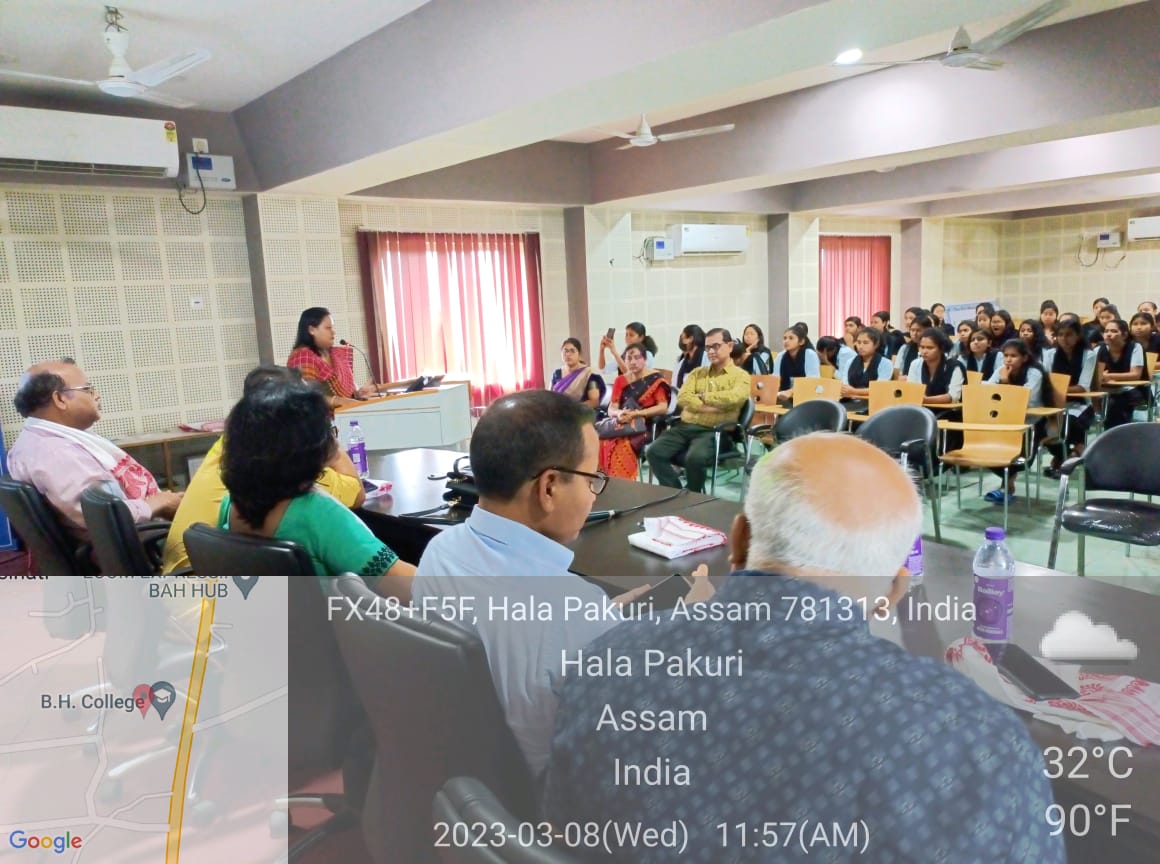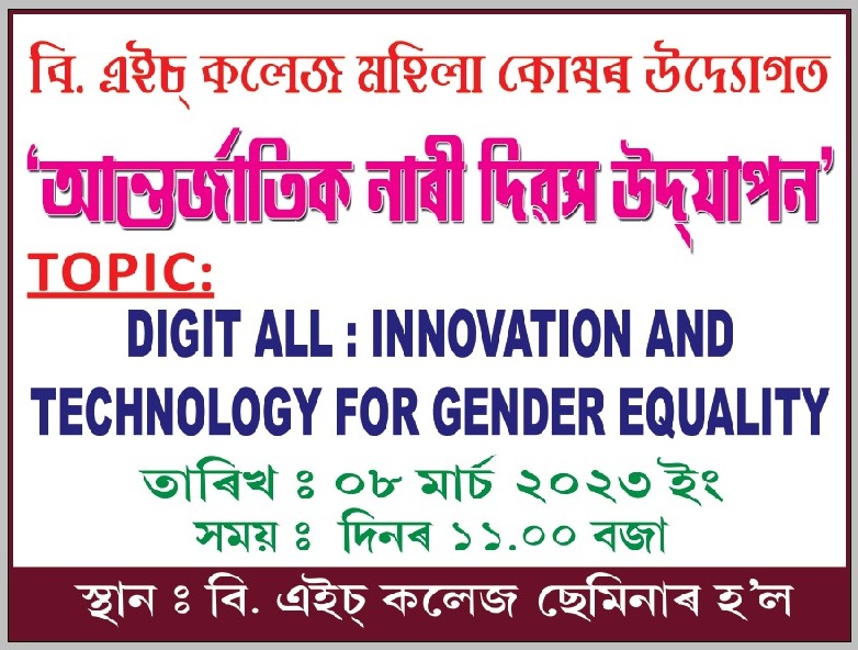 Description: On March 8th 2023, International Women’s Day was observed in the Seminar Hall of B.H.College, Howly under the aegis of the B.H. Collge Women’s Cell. The theme of the meeting, “Digit ALL: Innovation and Technology for Gender Equality”, remained the same as set forth by the United Nations Organisation. The meeting was presided over by Dr. Rodali Talukdar, seniormost member of B.H. College Women’s Cell. Dr. Jinakshi Chutia, Secretary of B.H. College Women’s Cell, outlined the purpose of the meeting. The meeting’s Keynote Speaker, Dr. Nabajit Das, Assistant Professor discussed women’s empowerment in relation to nations of different parts of the world viz. Vietnam and Kenya. He exhorted the students who were present at the event to develop self-learning and independence in every field. Another speaker at the event, Ms. Bidisha Duwarah, Assistant Professor, Dept. of English delivered an online audio lecture emphasizing the value of digital learning. She also exhorted the students to educate their own families and neighbours about digital technologies. She also talked about digital equity for women. The students were urged by Mrs. Usha Das, Associate Professor, Dept. of Assamese, to develop their digital literacy and also recommended to read online journals which are available free of cost. Prof. Sailen Kakati, Associate Professor, Dept. of Economics also motivated the students by speaking about Muhammed Yunus, the laureate of the Nobel Peace Prize on how he used simple innovative techniques for empowerment and uplifting of rural people. Dr. Deepmoni Das, Associate Professor and HoD, Dept. of Engilsh also gave an enriching speech related to women empowerment. Dr. Rabinjyoti Khataniar, Assistant Professor, Dept. of Economics & Coordinator, IQAC addressed the audience and emphasized upon Gender Equality and use of ICT tools in education. Dr. B.C. Pathak, the respected Principal of B.H. College, Howly shared his insights and experiences regarding the subject matter. The event could gather a sizable faculty members and students’ attendance. The event was really inspiring which enlightened the students and teachers alike and was in consonance with the theme put forwarded by the UNO. Dr. Padma Sarkar, Assistant Professor offered the Vote of Thanks at the conclusion of the meeting.