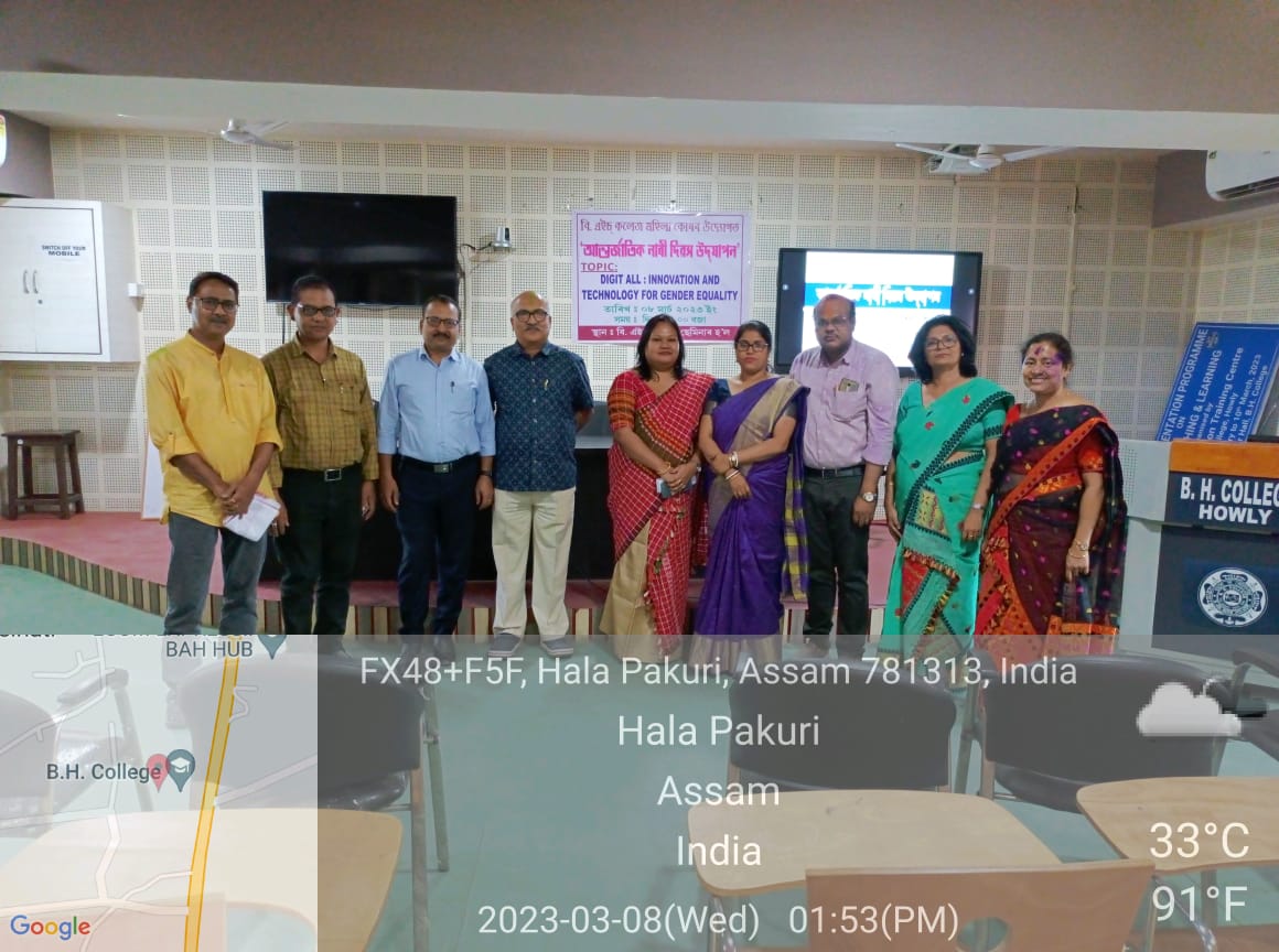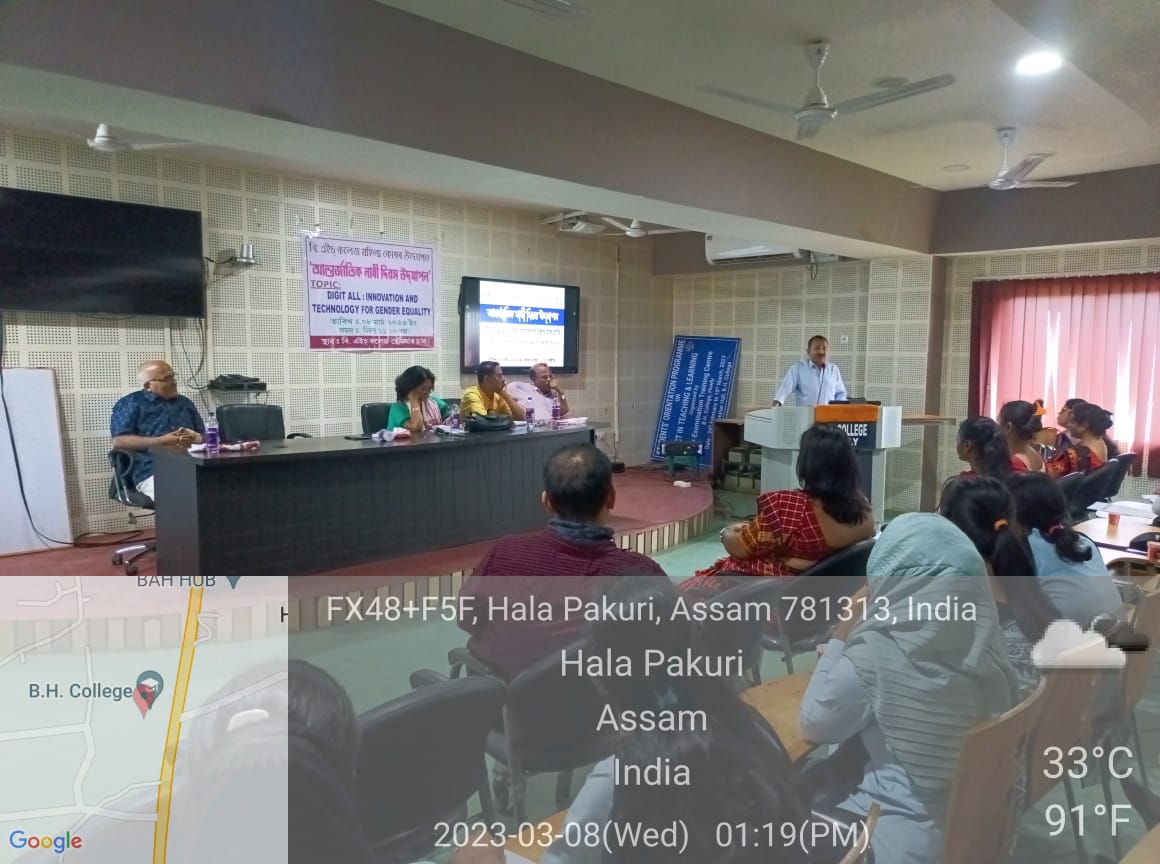 Description: On March 8th 2023, International Women’s Day was observed in the Seminar Hall of B.H.College, Howly under the aegis of the B.H. Collge Women’s Cell. The theme of the meeting, “Digit ALL: Innovation and Technology for Gender Equality”, remained the same as set forth by the United Nations Organisation. The meeting was presided over by Dr. Rodali Talukdar, seniormost member of B.H. College Women’s Cell. Dr. Jinakshi Chutia, Secretary of B.H. College Women’s Cell, outlined the purpose of the meeting. The meeting’s Keynote Speaker, Dr. Nabajit Das, Assistant Professor discussed women’s empowerment in relation to nations of different parts of the world viz. Vietnam and Kenya. He exhorted the students who were present at the event to develop self-learning and independence in every field. Another speaker at the event, Ms. Bidisha Duwarah, Assistant Professor, Dept. of English delivered an online audio lecture emphasizing the value of digital learning. She also exhorted the students to educate their own families and neighbours about digital technologies. She also talked about digital equity for women. The students were urged by Mrs. Usha Das, Associate Professor, Dept. of Assamese, to develop their digital literacy and also recommended to read online journals which are available free of cost. Prof. Sailen Kakati, Associate Professor, Dept. of Economics also motivated the students by speaking about Muhammed Yunus, the laureate of the Nobel Peace Prize on how he used simple innovative techniques for empowerment and uplifting of rural people. Dr. Deepmoni Das, Associate Professor and HoD, Dept. of Engilsh also gave an enriching speech related to women empowerment. Dr. Rabinjyoti Khataniar, Assistant Professor, Dept. of Economics & Coordinator, IQAC addressed the audience and emphasized upon Gender Equality and use of ICT tools in education. Dr. B.C. Pathak, the respected Principal of B.H. College, Howly shared his insights and experiences regarding the subject matter. The event could gather a sizable faculty members and students’ attendance. The event was really inspiring which enlightened the students and teachers alike and was in consonance with the theme put forwarded by the UNO. Dr. Padma Sarkar, Assistant Professor offered the Vote of Thanks at the conclusion of the meeting.