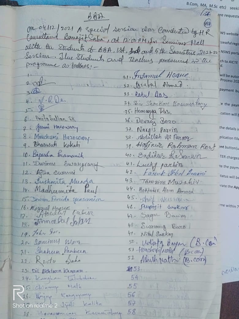 Description: A special Session was conducted by HR Consultant Banajit Saha, at 12.00 AM in the College Seminar Hall with BBA 1st, #rd and 5th Semester Students. The teachers and Students attended the are attached herewith-