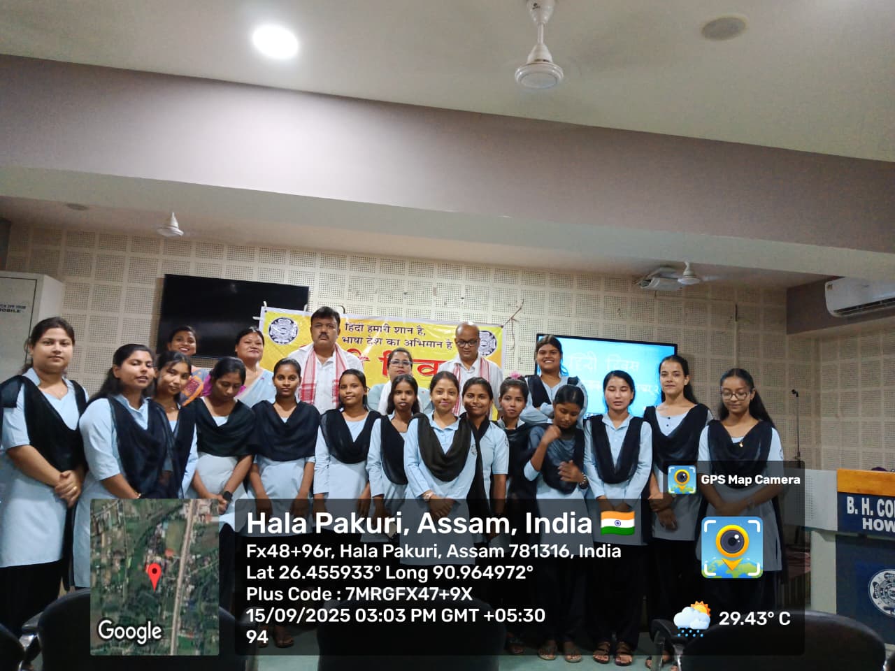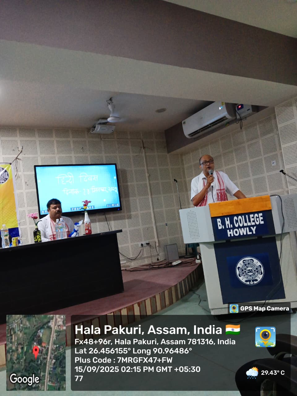 Description: This year Hindi Department observes Hindi Day (14th September) to inculcate values like self-respect, National integrity, social equality etc. in this occasion Department organizes various competitions and programmes in the college. Students in large numbers participate and mark their respect towards the nation and national language. Students are given the opportunity to organize and participate in a variety of co-curricular competitions like Essay writing, Extempore Speech, Painting, Products made from waste materials etc. Winners are given away the prizes on valedictory Day. Dr. Rajkumari Das, HoD of the department presided the meeting and gave introductory speech. Dr. B.C. Pathak, Principal, B.H. College, Dr. Sultan Ali Ahmed,Associate Professor & HoD, deptt.of English,Mr. Nayanmoni Hazarika,Associate Professor & HoD, deptt.of History, & Mr. Imran Hussain, Assistant Professor,deptt. of History were invited as chief guest to deliver lecture on the significance of the official language. Faculty members of the department appreciate the talents of students with gifts. Senior students are given the opportunity to conduct the competitions and organize the Hindi function and they prove their leadership qualities and organizing skills.