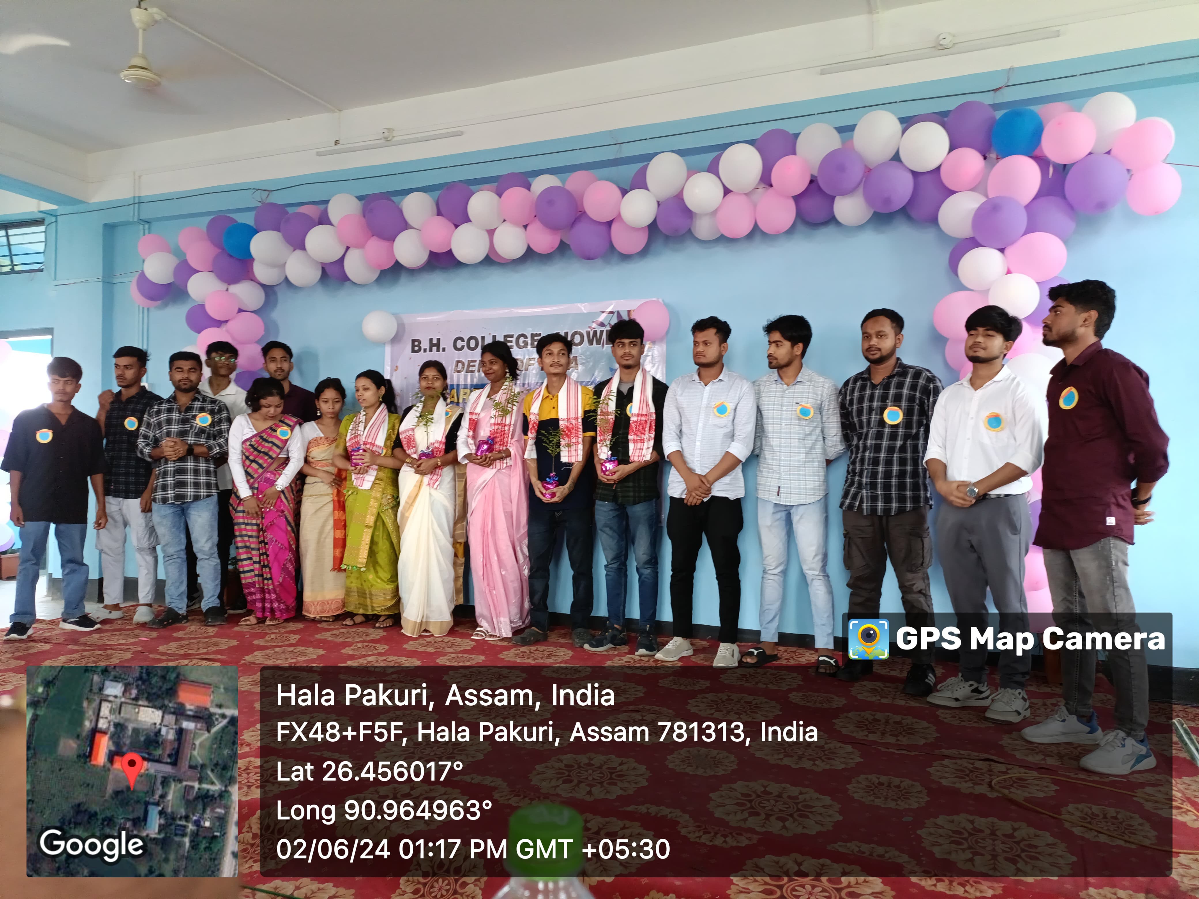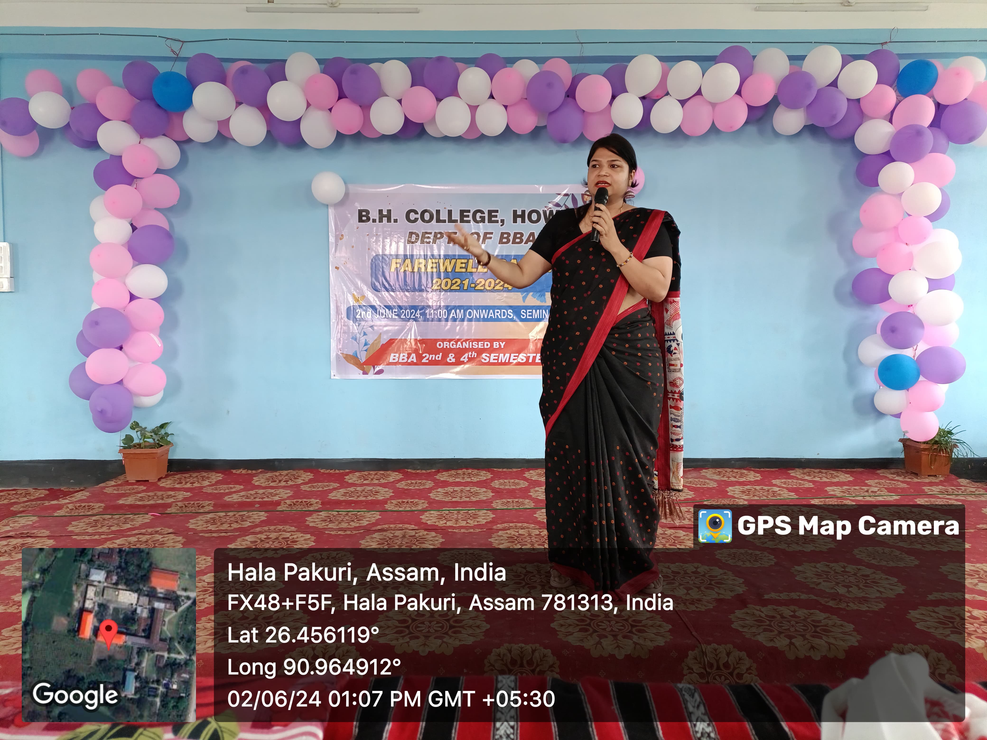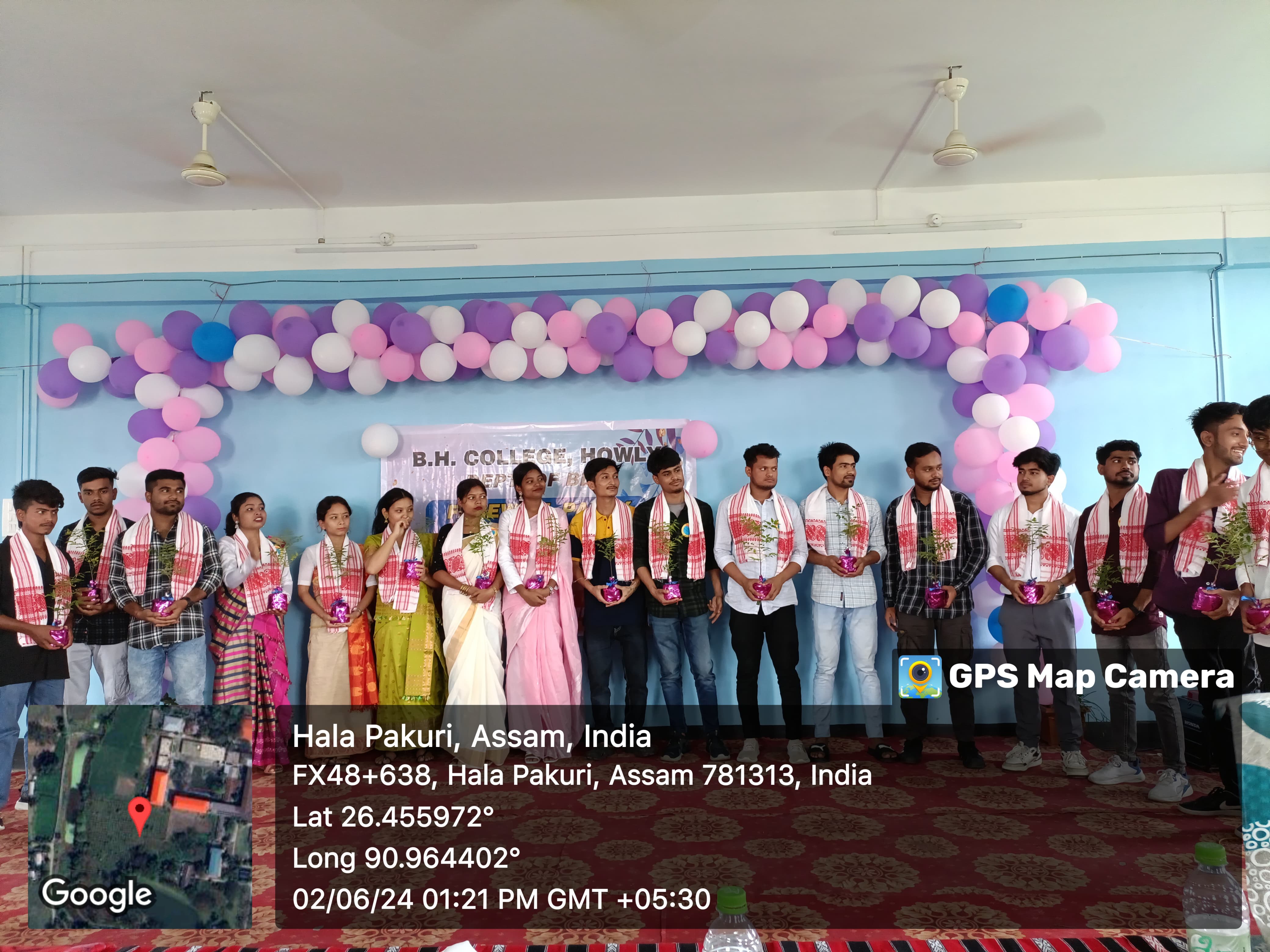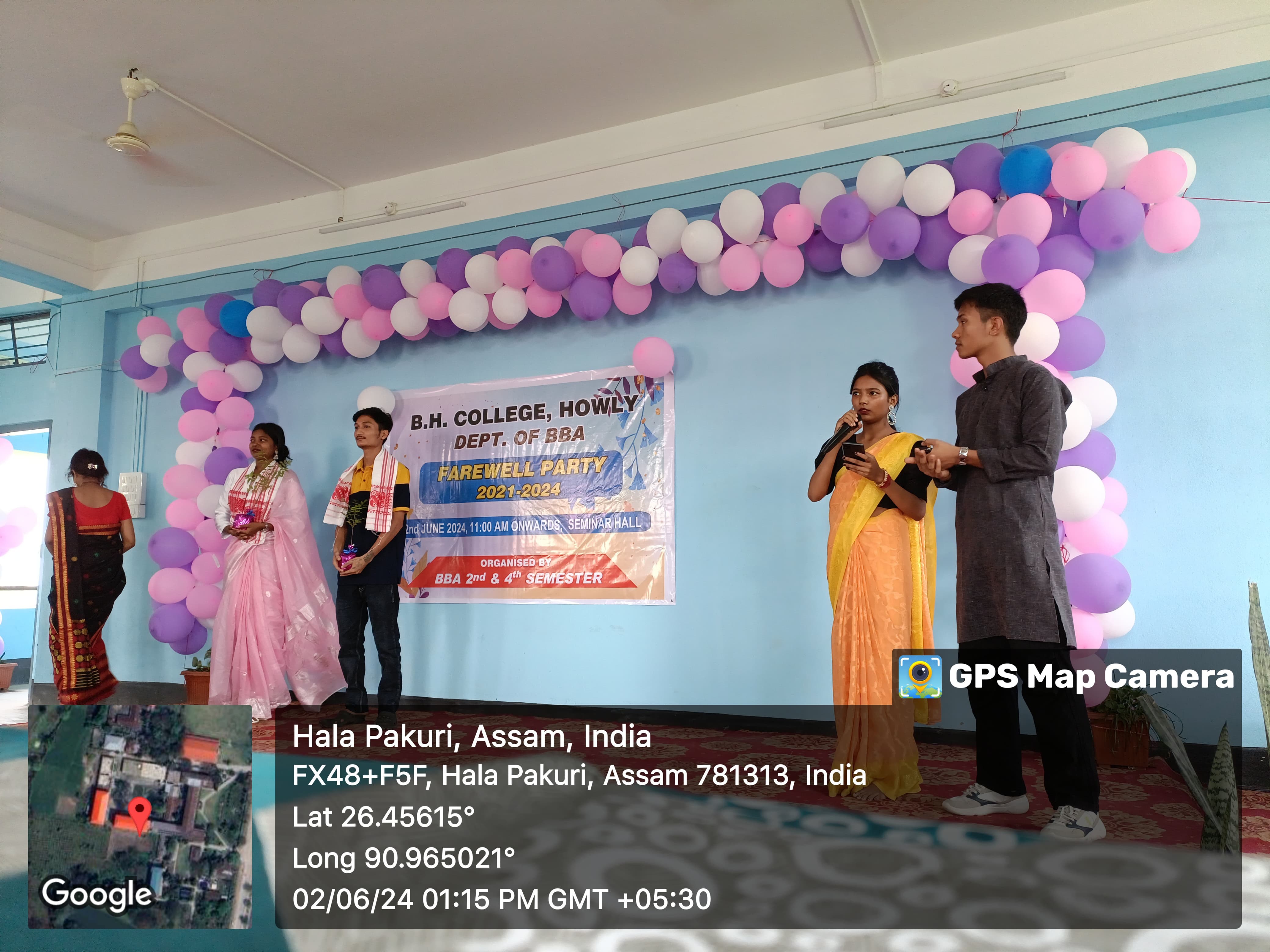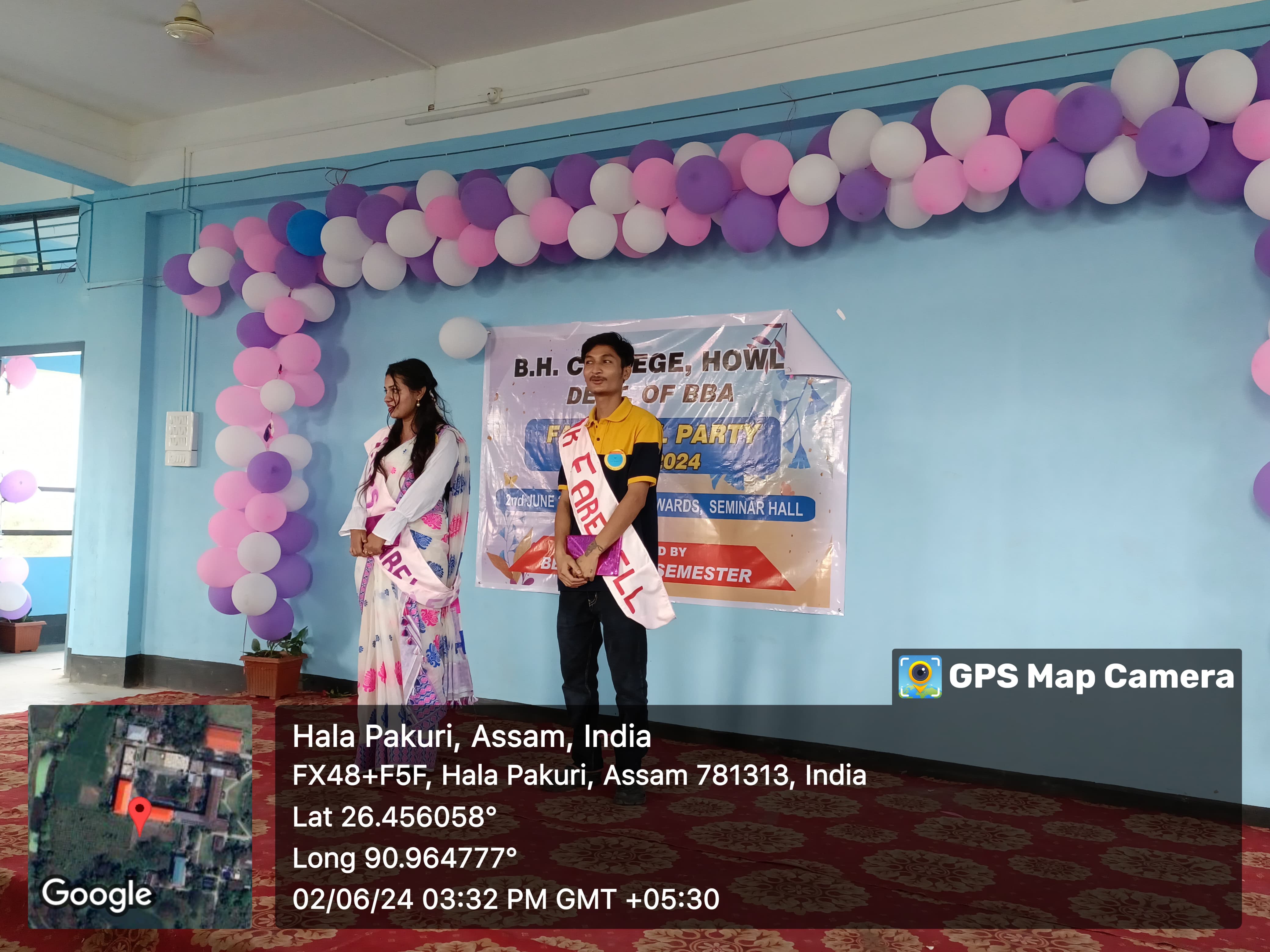 Description: The 2nd and 4th Semester students of Department of BBA-2024, organized farewell programme of BBA 6th Sem Batch-2024. All the students and teachers participated in the same and Miss Ruksana Khatun and Swrang Baro have been selected as Miss & Mr. farewell in the programme. Photos of the event attached.