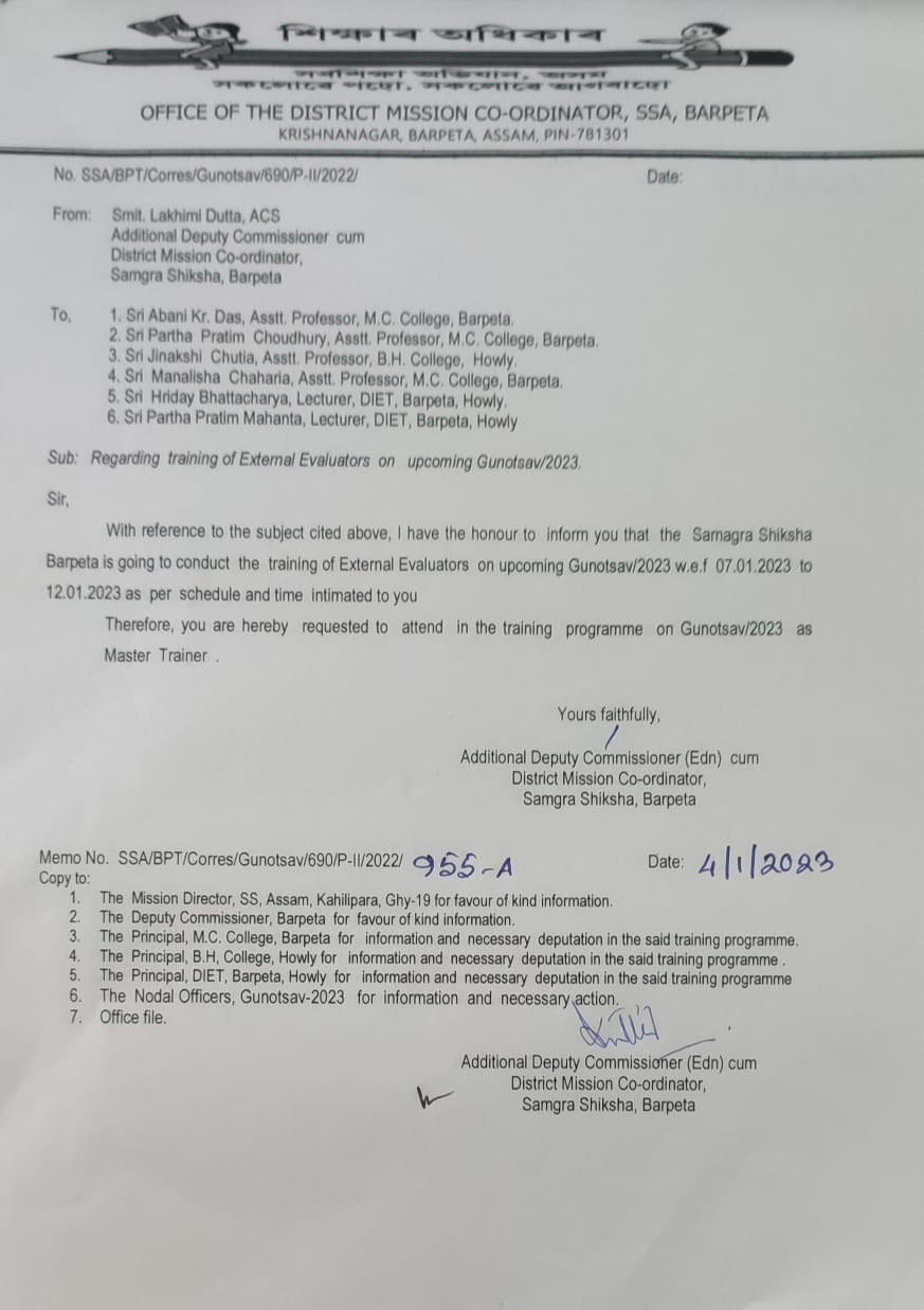 Description: The Samagra Shiksha, Barpeta conducted the training of External Evaluators on Gunotsav/2023 w.e.f. 07/01/2023 to12/01/2023. In connection with this pragramme our faculty Dr.Jinakshi Chutia appointed as Master Trainer on Gunotsav/2023.