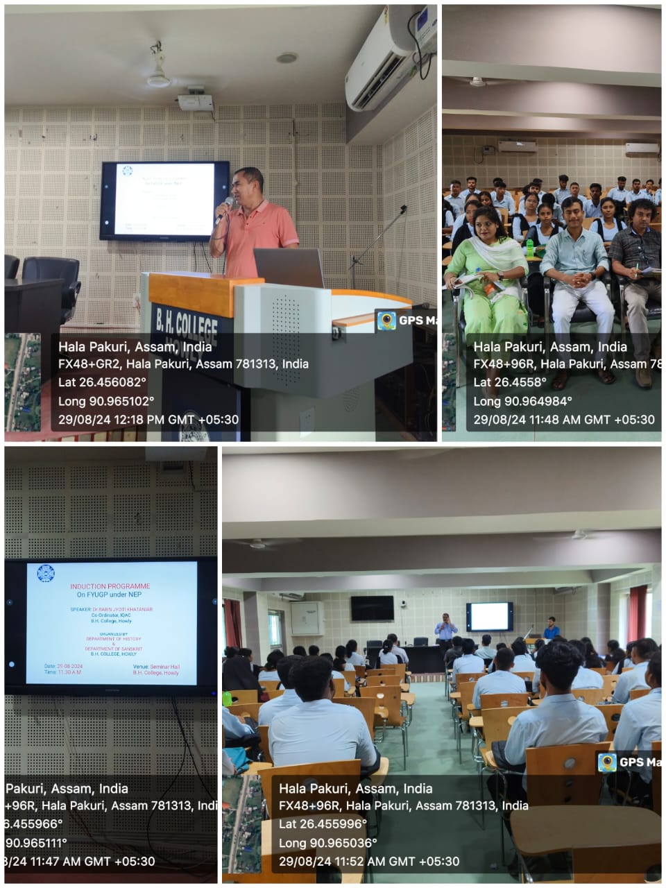 Description: Department of Sanskrit organizes the Induction Programme on NEP for the students of First semester on 29/08/2024 at Seminar Hall in collaboration with Department of History, B.H. College. Dr. Rabinjyoti Khataniar, Co-ordinator of IQAC, B.H. College was the resource person at the programme.