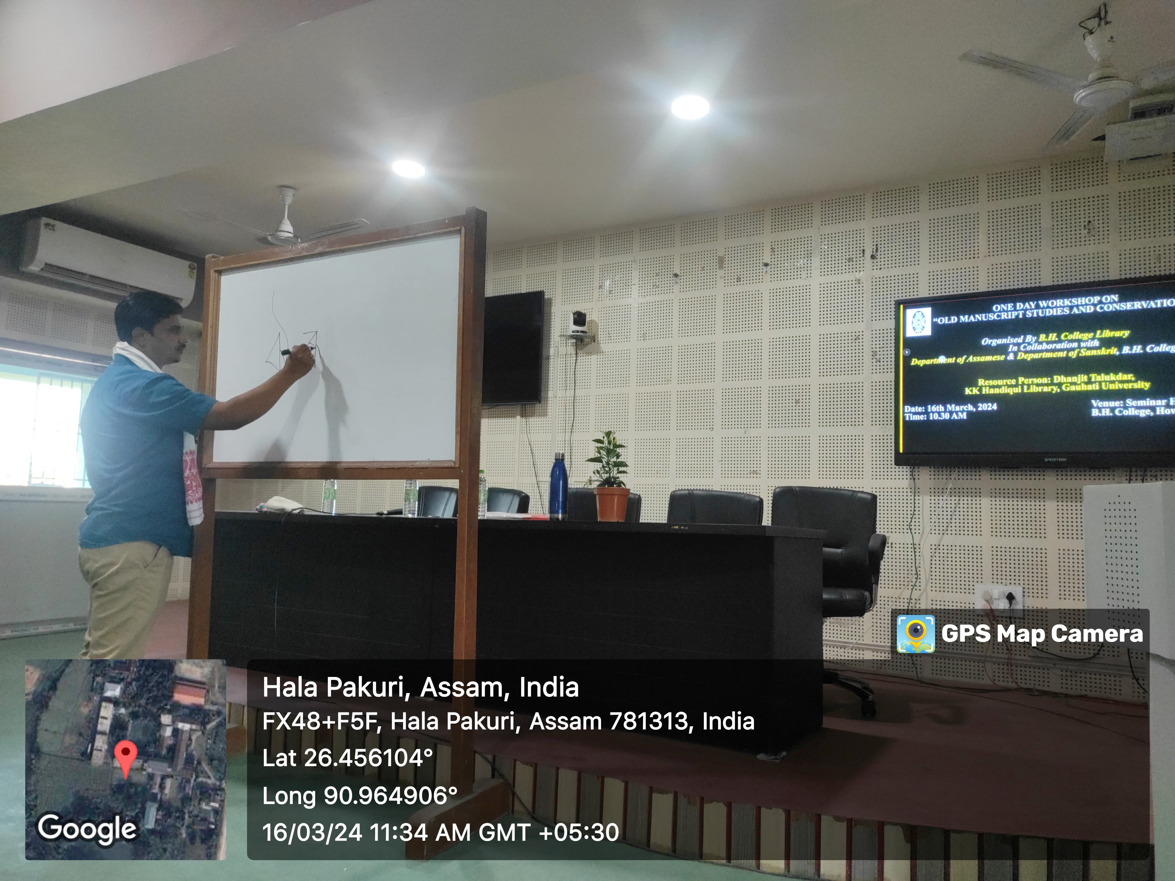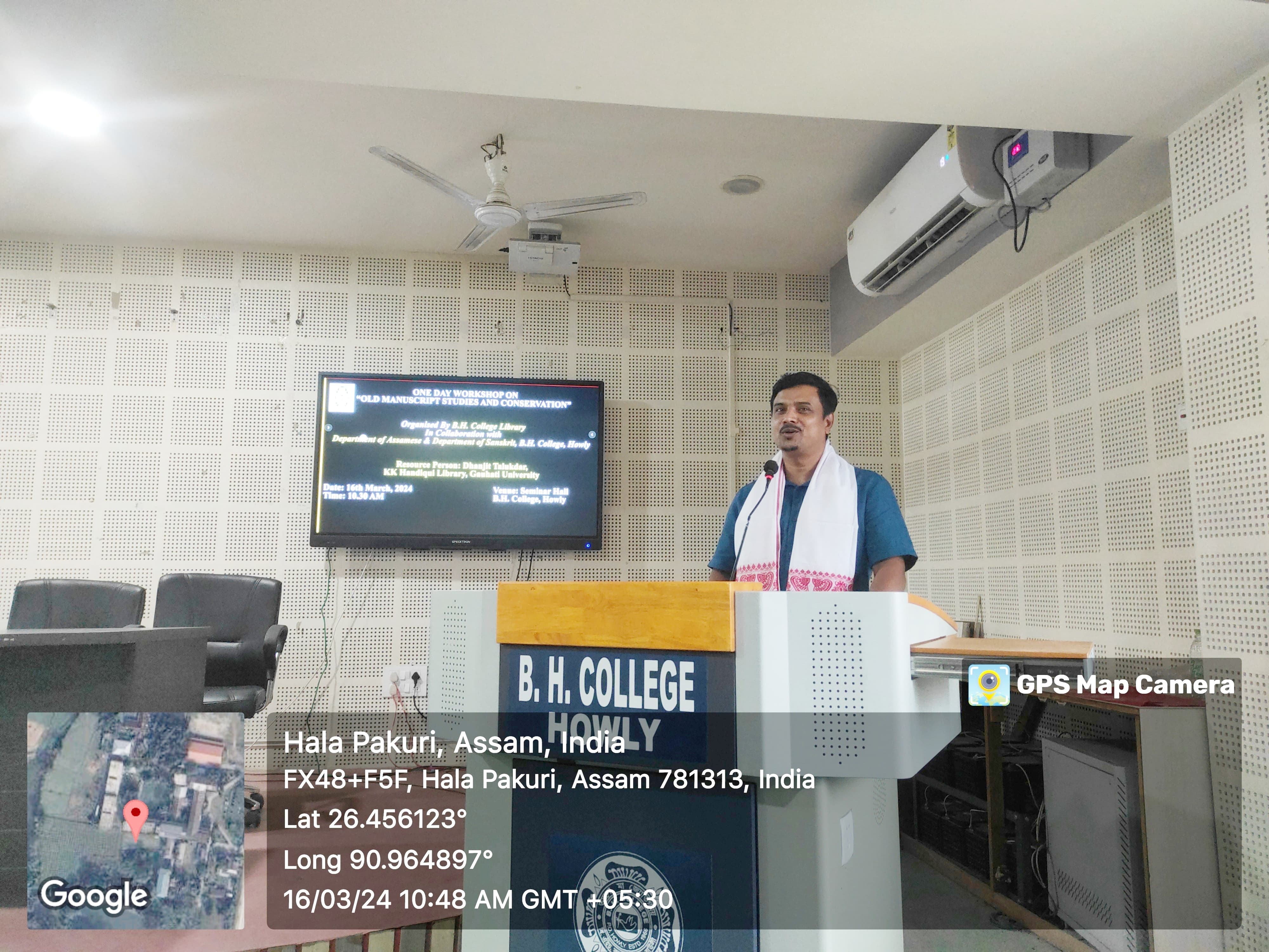 Description: A one Day Workshop on "Ancient Manuscript Studies and Conservation" was organized by the department of Sanskrit in collaboration with the Deptt. of Assamese, B.H. College and B.H College Library on 16th March,2024. The Programme was led by Dr. Tribeni Pathak, Librarian of B.H. College and Mr. Dhanjit Talukdar, a Script Expert of Manuscirpt Section, KKH Library of Gauhati University was the Resource person of the programme. There were almost 60 students participated in the workshop.