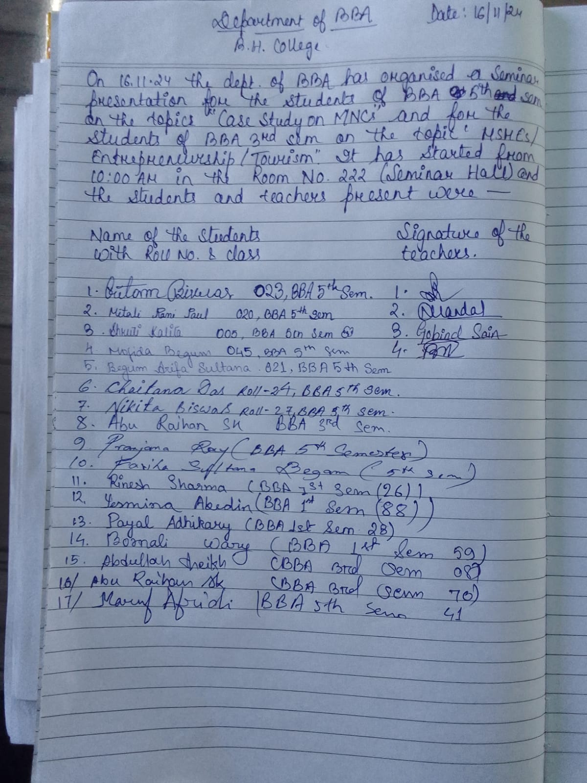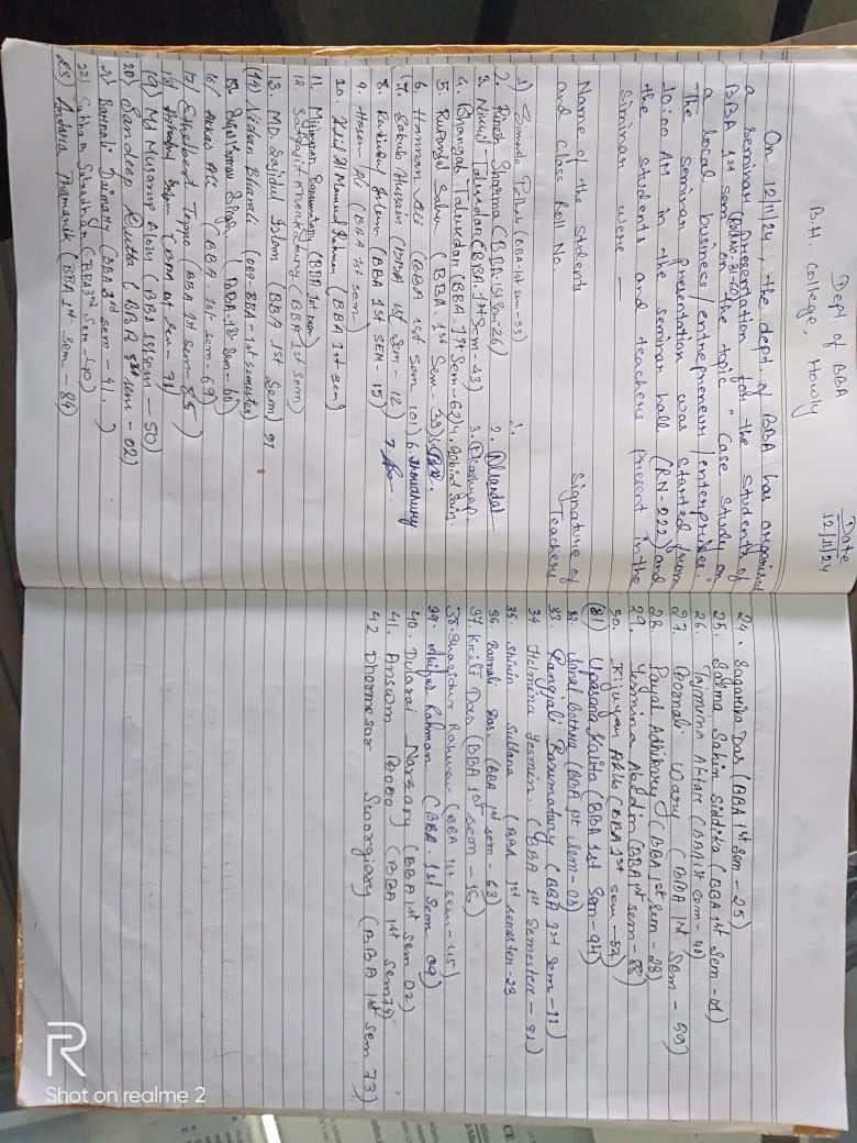 Description: A BBA 1st Semester Students Seminar presentation was arranged for the students of BBA 1st Semester-2024, from class Roll No- 61 to 101. Students gave their PPT presentation in the college Seminar Hall No-222, on the topic of a case study on local business enterprises/entrepreneurs.