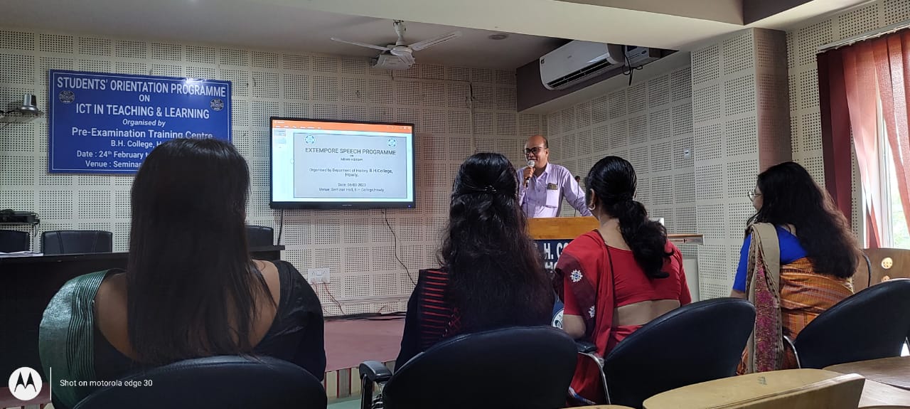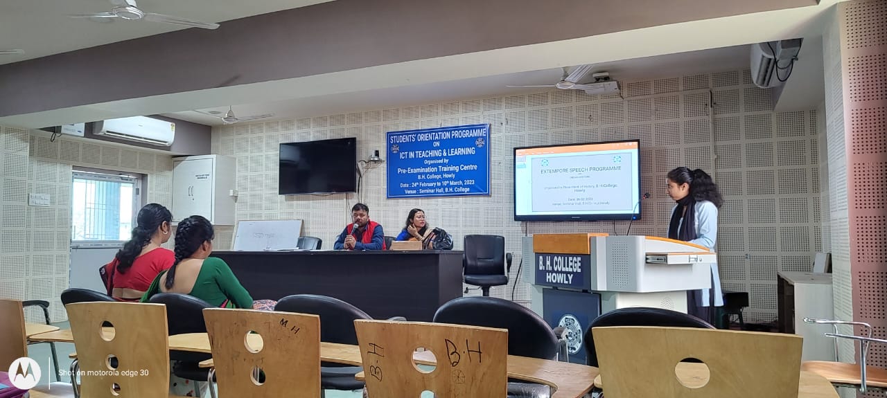 Description: An Extempore Speech programme was conducted on 6/3/2023 by the History Deptt B.H. College Howly , venue , Seminar Hall in order to make confident on Indian History as the programme was specified to the topic Indian History splitting into various sub-themes .The participation of the students of all Semesters are a satisfactory one. The programme was inaugurated by Dr Sultan Ali Ahmed , Dept.of English through the deliberation of an encouraging speech .