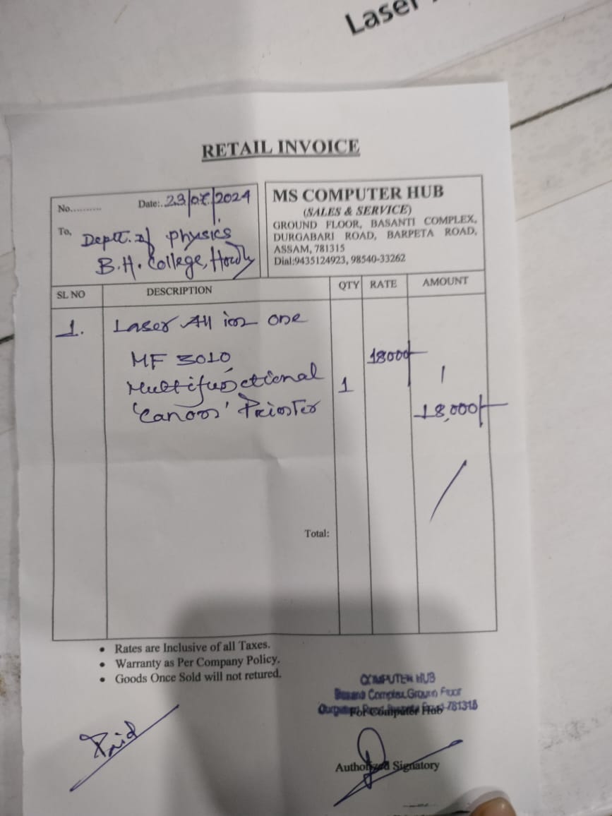Description: The Alumni association of Physics Department has donated the following two items for the Department: 1. canon printer cum photostat machine @18,000/- and 2. An almirah @9,000, total=27,000