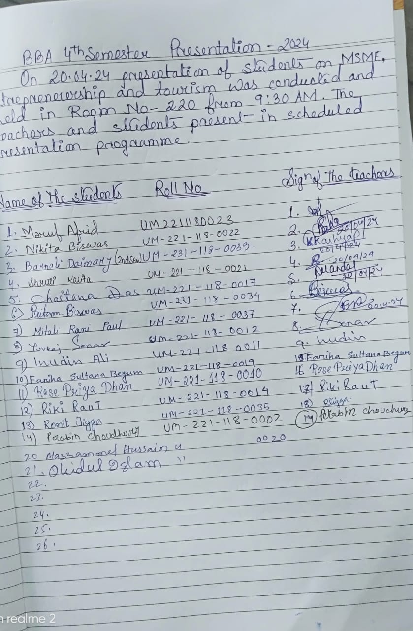 Description: A Seminar presentation was arranged for the students of BBA 4th Semester-2024. Students gave their PPT presentation in the college Room No-220, on the topics MSMEs/Tourism/Entrepreneurship etc.