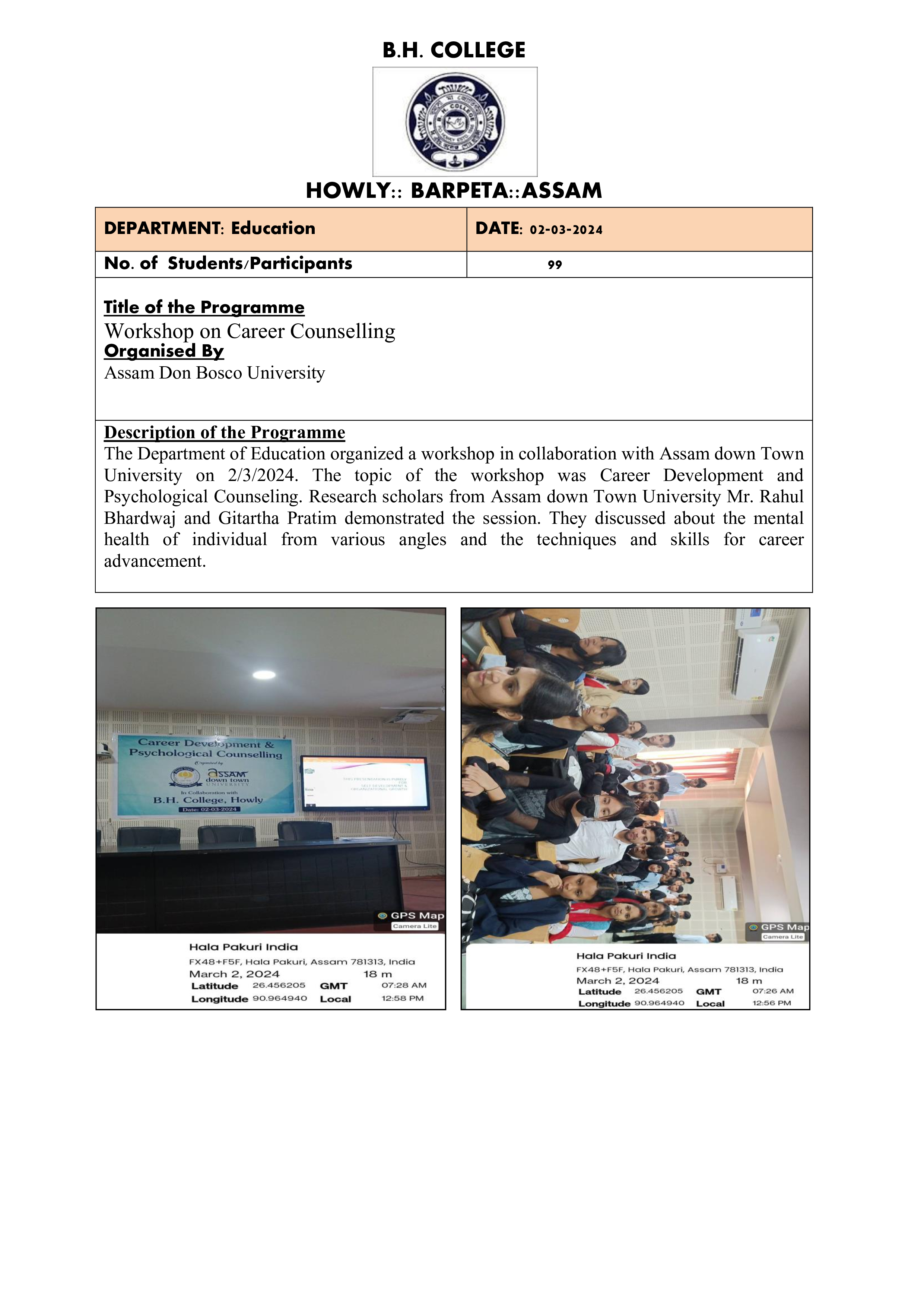 Description: The Department of Education organized a workshop in collaboration with Assam down Town University on 2/3/2024. The topic of the workshop was Career Development and Psychological Counseling. Research scholars from Assam down Town University Mr. Rahul Bhardwaj and Gitartha Pratim demonstrated the session. They discussed about the mental health of individual from various angles and the techniques and skills for career advancement.