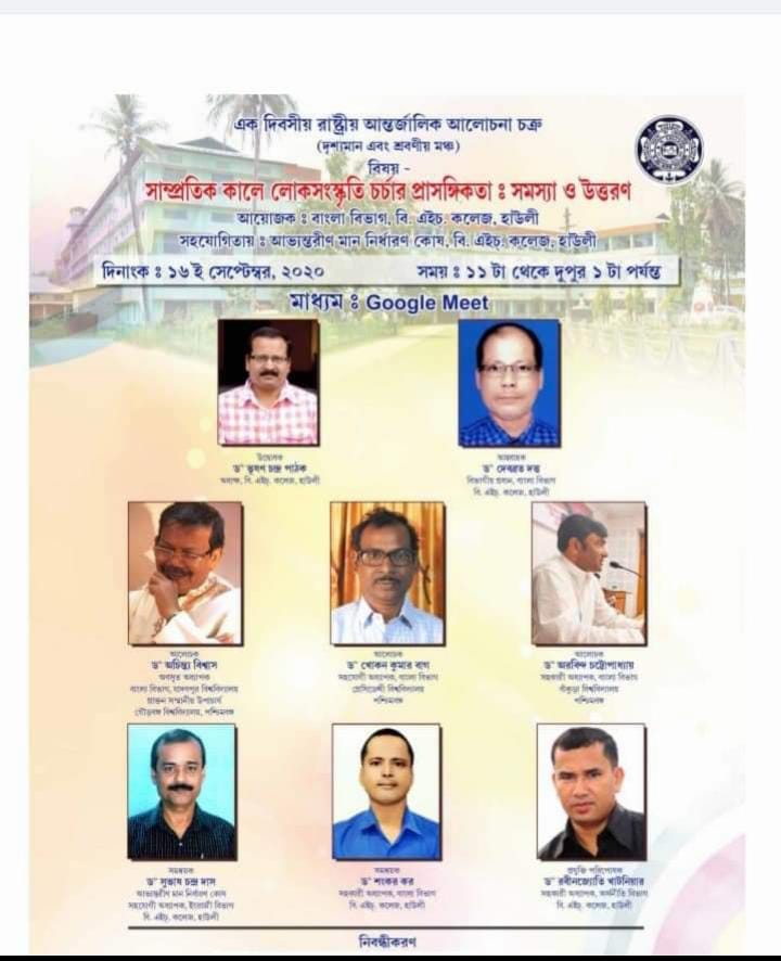 Description: An online Seminar was held on the topic "Sampratik Kale Lokasanskriti Charchar Prasangikata : Samashya O uttran" on 16th September 2020 organized by Department of Bengali In Collaboration with IQAC, B.H. College, Howly. Dr. Bhushan Chandra Pathak, the principal of B.H.college, Howly was the inaugurator and delivered his valuable speech. The in-charge of this seminar Dr. Debabrata Dutta, HoD of Bengali Department, B.H. College, Howly delivered his keynotes of the programme. The coordinator Dr. Sankar kar welcomed all the Resource persons attended through online mode. About 110 participants from Assam, Tripura, Bengal and other places of India joined the Webinar. At the end, both the faculty members of the Dept. Bengali Dr. Debabrata Dutta and Dr. Sankar kar thanked all the members present the prorgamme.