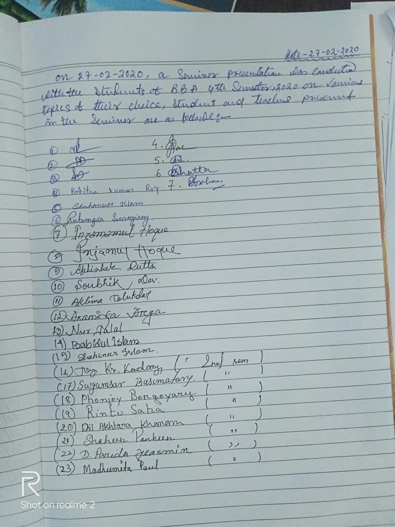 Description: A Seminar presentation was arranged for the BBA 4th Semester Students, they gave their PPT presentation on various topics of their choice. The students and teachers present there attached herewith..
